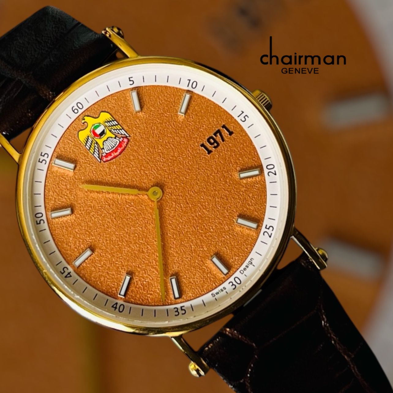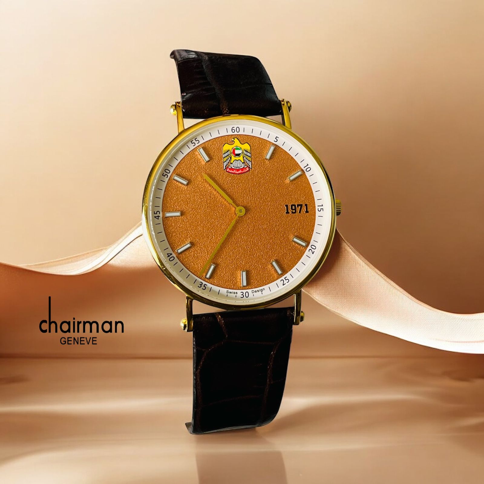 Elevate your wrist with the Chairman Geneve UAE Emblem watch, a sophisticated timepiece that blends heritage with contemporary elegance. Featuring a striking golden dial adorned with the prestigious UAE emblem, this gents watch makes a bold statement of pride and refinement. The sleek black leather strap provides comfort and versatility, complementing both formal occasions and everyday wear. Precision-engineered for reliability, this watch combines timeless design with modern craftsmanship, making it an essential accessory for the discerning gentleman who values quality and cultural significance.