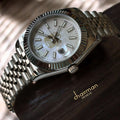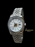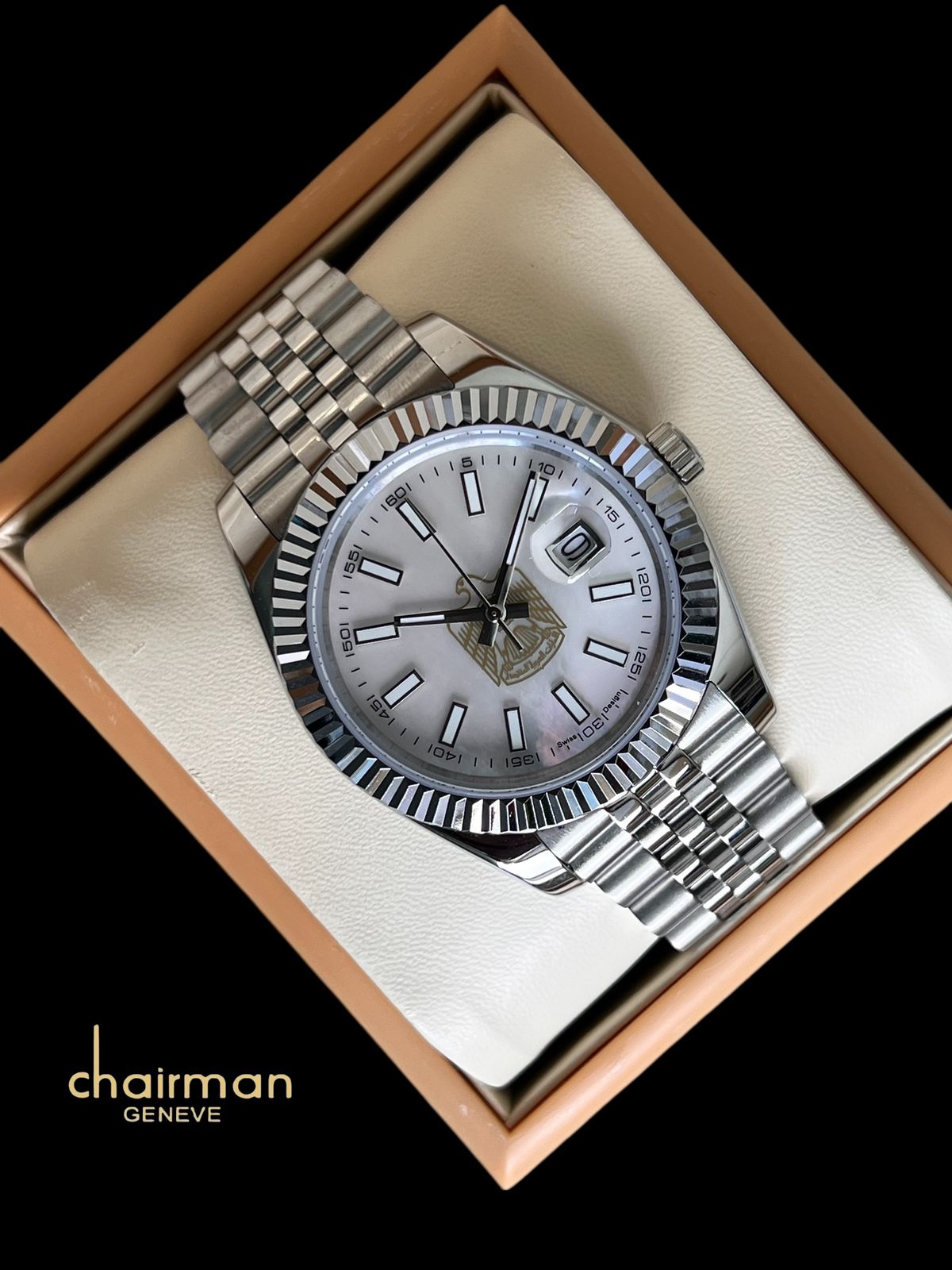 Elevate your wrist with the Chairman Geneve UAE Emblem White Dated Dial Silver Chain Gents Watch—a sophisticated timepiece that blends heritage with contemporary elegance. Featuring a pristine white dial with date window functionality, this watch delivers both style and practicality for the modern gentleman. The polished silver chain bracelet exudes refined luxury, while the UAE emblem adds a distinctive touch of regional pride. Precision-engineered for reliability, this timepiece is the perfect accessory for business meetings, formal occasions, or everyday wear. Make a statement with timeless sophistication.