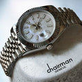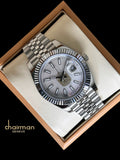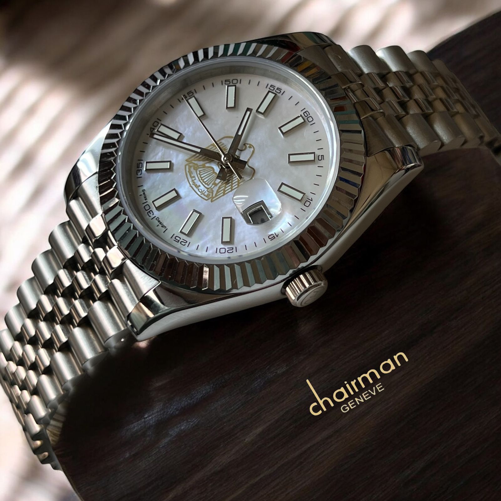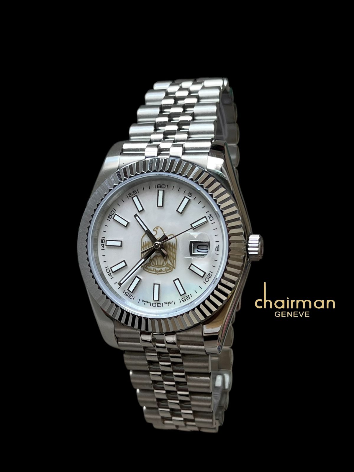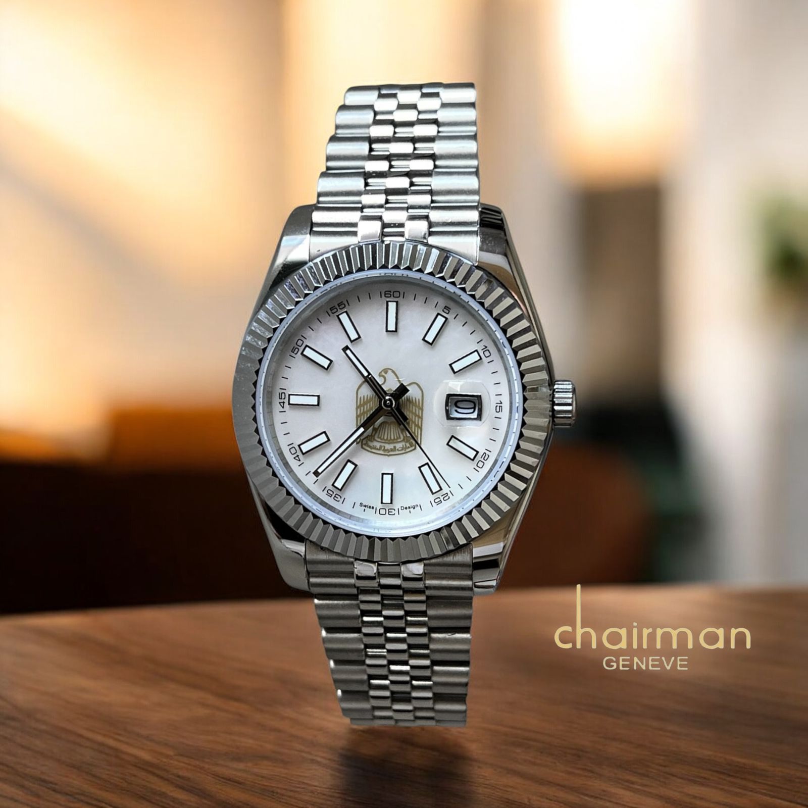 Chairman Geneve UAE Emblem White Dated Dial Silver Chain Gents Watch