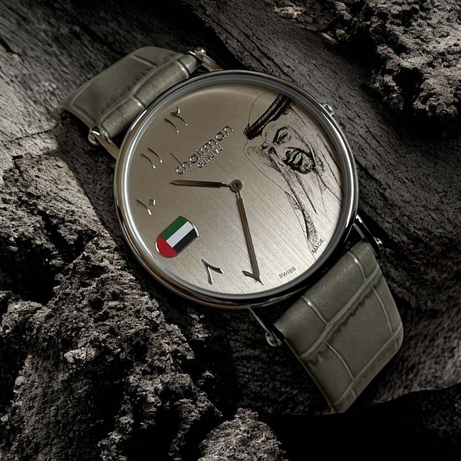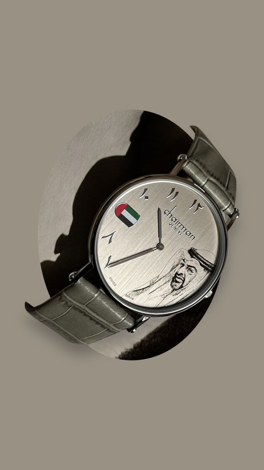 Chairman Geneve UAE Flag And Sheikh Photo Grey Arabic Dial Grey Strap Gents Watch