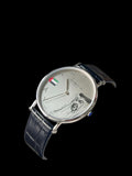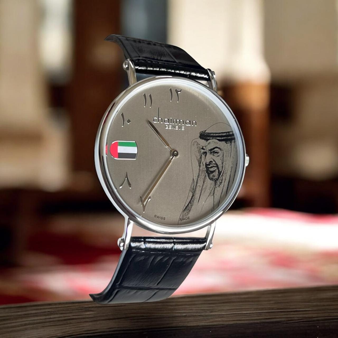 Elevate your style with the Chairman Geneve UAE Sheik Flag Photo watch. Featuring a striking grey dial adorned with Arabic numerals and a detailed UAE Sheik flag image, this timepiece combines culture and elegance. The sleek black strap offers a comfortable fit, making it the perfect accessory for any gentleman seeking a sophisticated yet meaningful watch.
