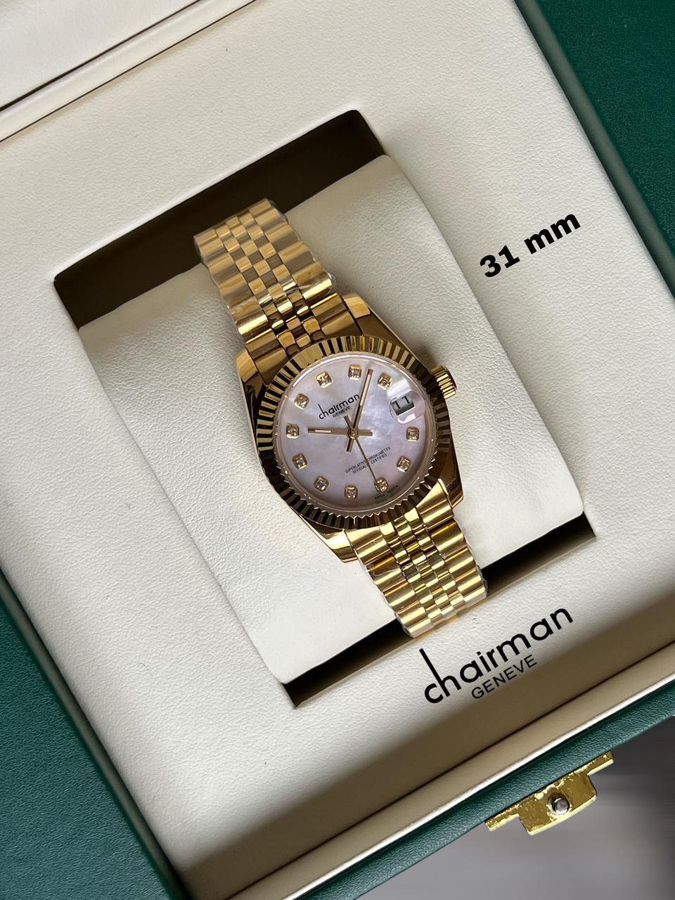 Introducing the elegant and sophisticated Chairman Geneve White Dated Stone Dial Golden Chain Ladies Watch. Featuring a beautiful white stone dial and a luxurious golden chain, this watch will elevate any outfit. Stay on time and in style with this timeless piece.