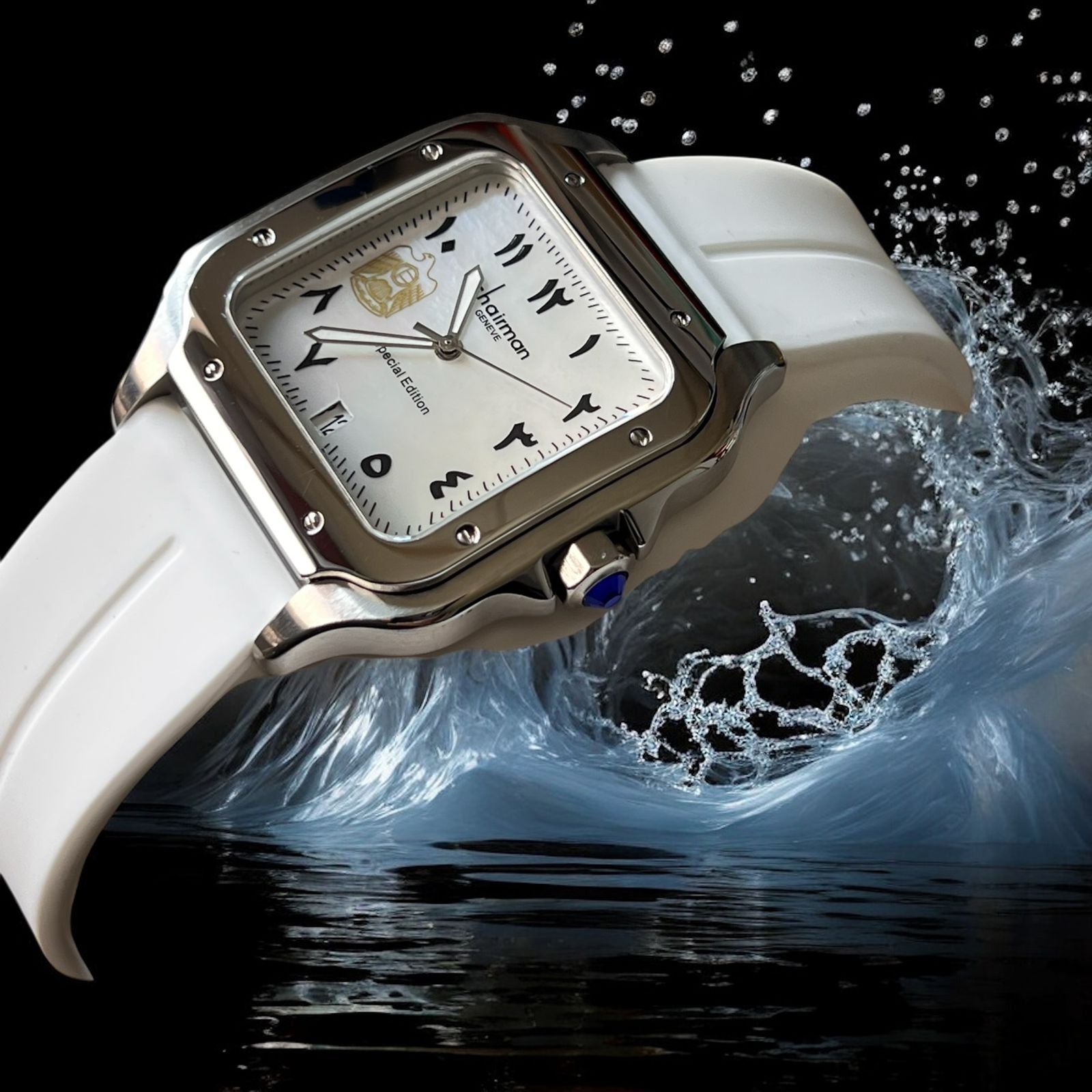 The Chairman Geneve White UAE Emblem Gents Watch combines elegance and heritage with a crisp white strap and a unique Arabic dial. Featuring the UAE emblem and dated markings, this watch is a perfect blend of tradition and style, designed for the modern gentleman who values both sophistication and cultural pride. Its sleek design ensures it complements any outfit, making it ideal for daily wear or special occasions.