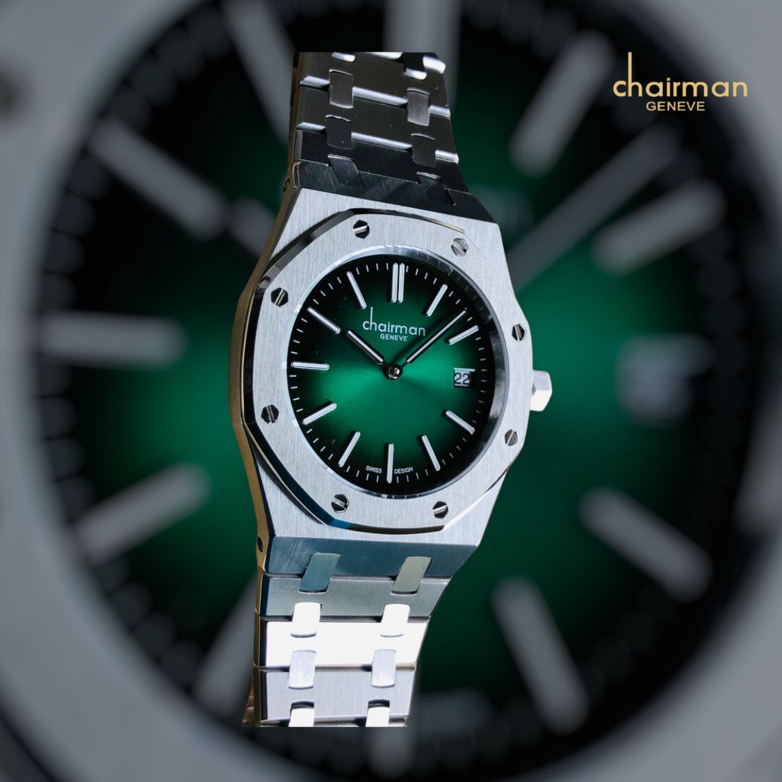ساعة شيرمان فضية بأرقام عربية وحزام من الفضة ومينا خضراء للرجال
