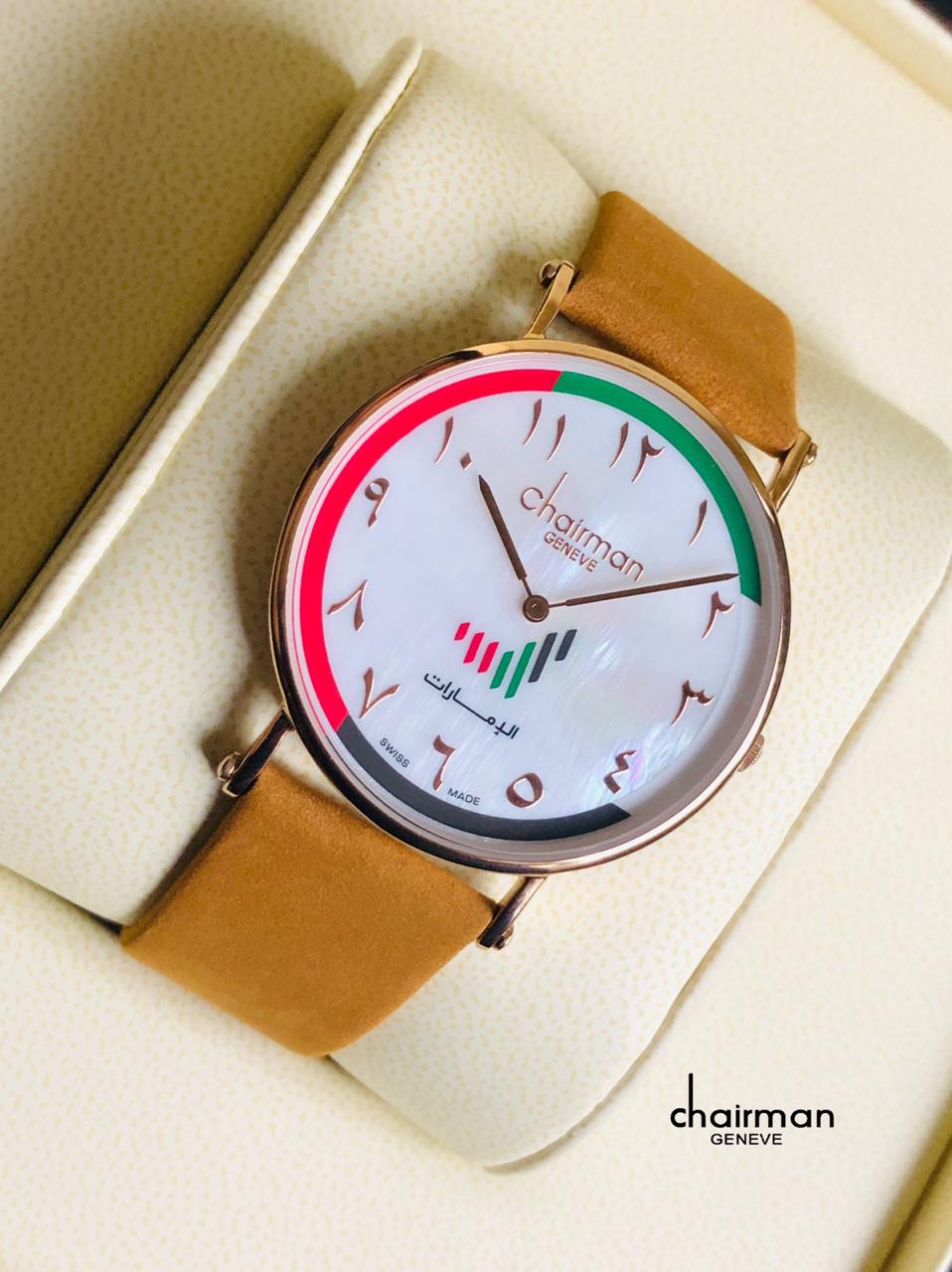 ساعة رجالية بتصميم علم الإمارات العربية المتحدة ومينا بيضاء وحزام بني