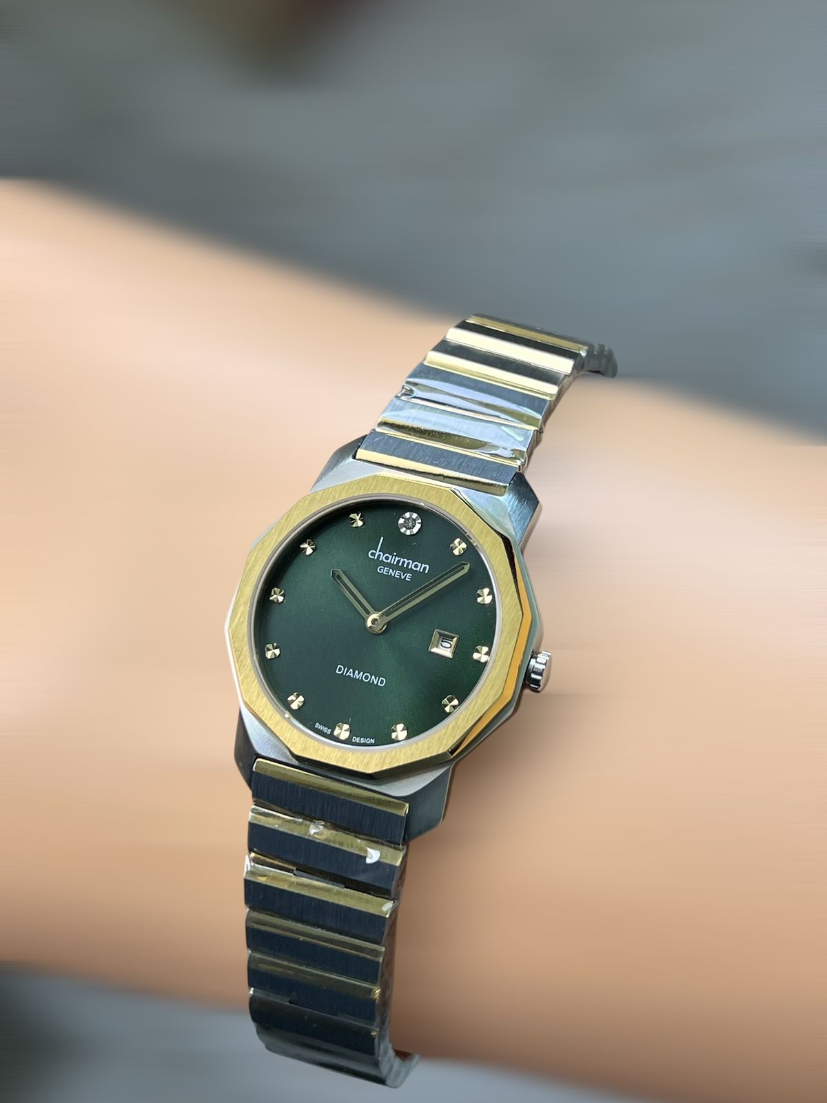 Diamond Chairman Geneve Dated Green Dial Silver And Gold Chain Ladies Watch