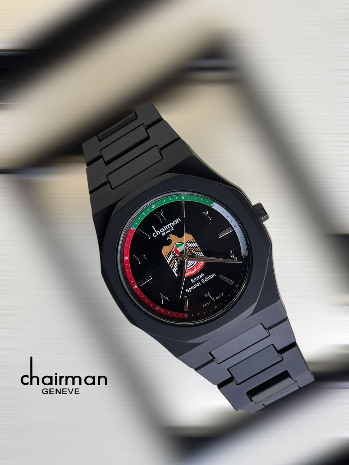 Experience timeless elegance with the Emirati Special Edition Chairman Geneve watch. Featuring a bold black dial with Arabic numerals and the distinguished UAE emblem, this timepiece reflects heritage and style. The sleek black strap ensures a comfortable fit for gents, making it perfect for both formal and casual occasions. Embrace luxury that honors tradition with every glance at this exclusive watch.