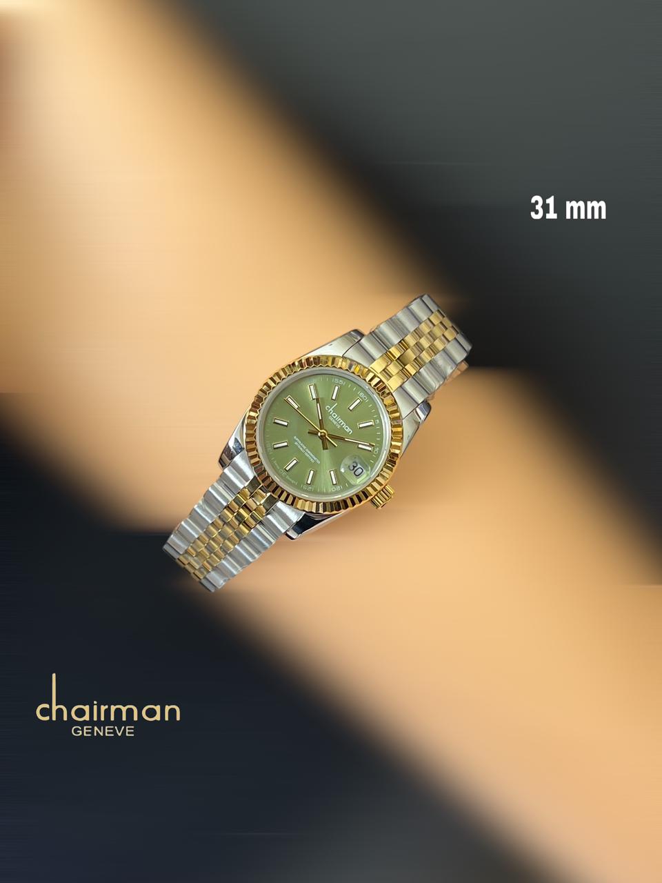ساعة نسائية من Chairman Geneve بمينا خضراء وحزام ذهبي وفضي