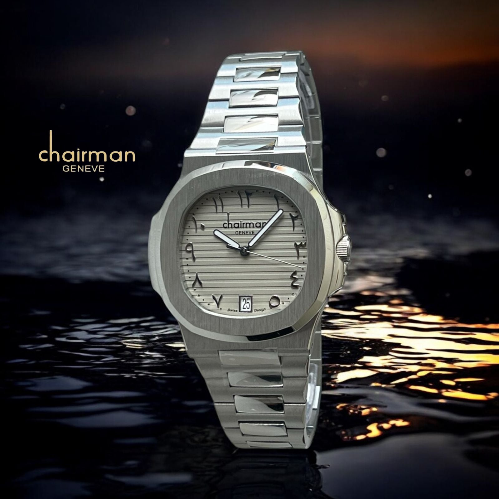 ساعة تشيرمين جينيف للرجال بسوار فضي ومينا رمادية مؤرخة باللغة العربية