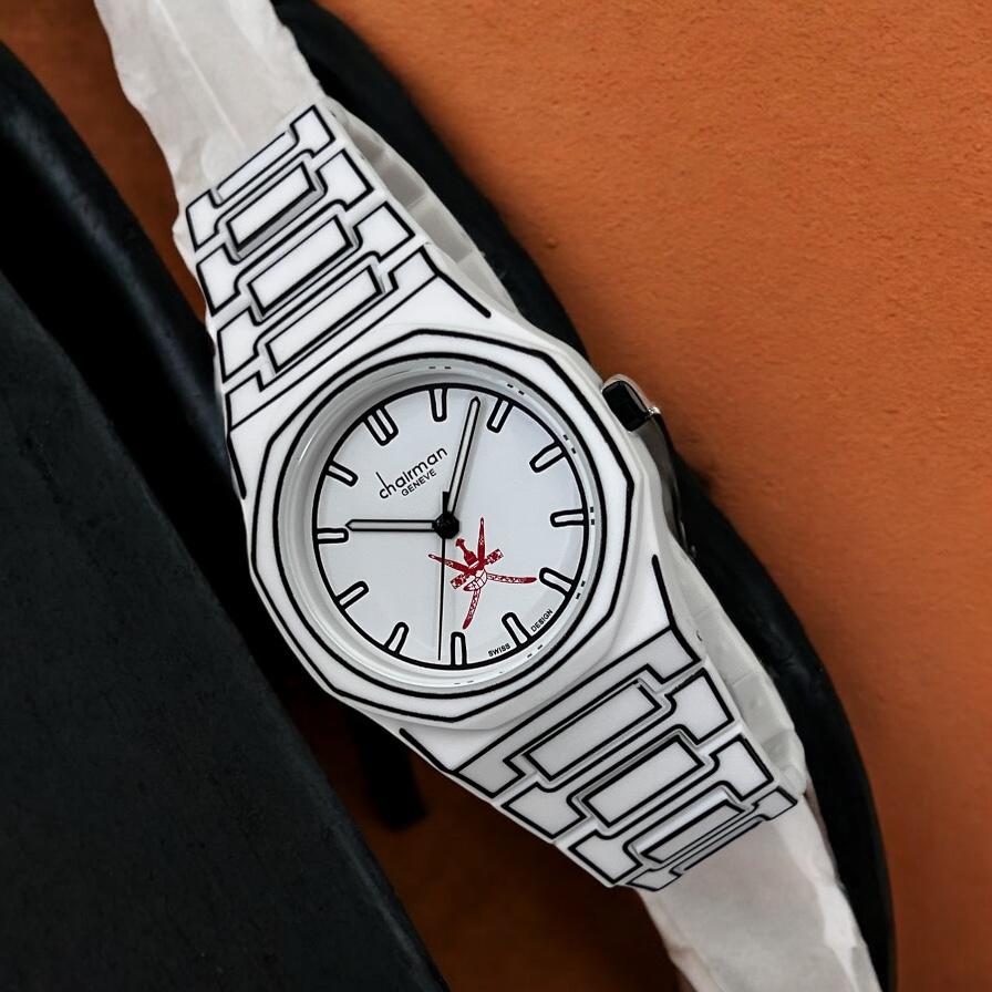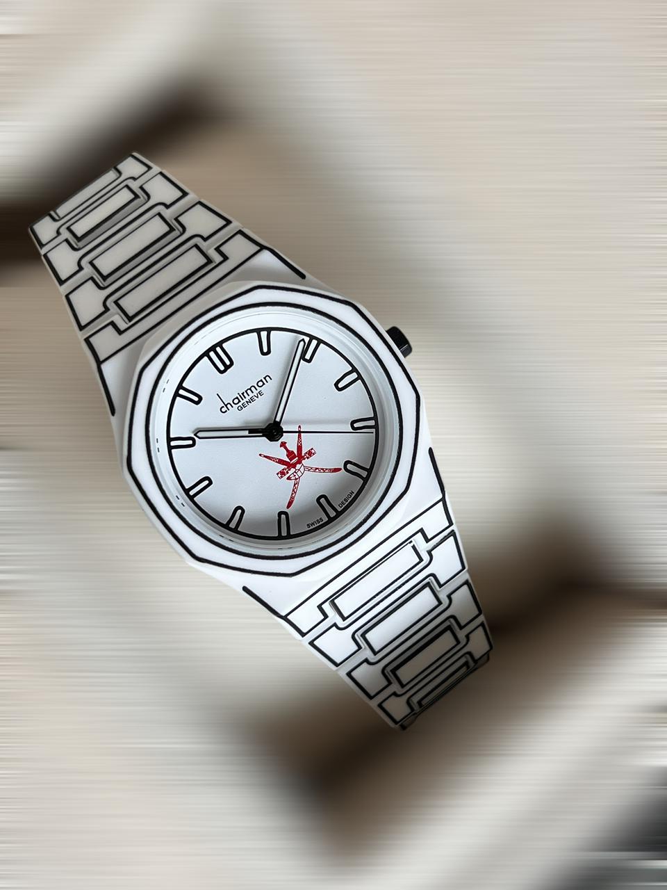 Capture the essence of OMAN with this sleek Chairman Geneve watch. Boasting a white poly carbon case and dial adorned with the national emblem, this timepiece adds a touch of elegance and patriotism to any outfit. Show off your style and love for your country with this unique watch.