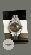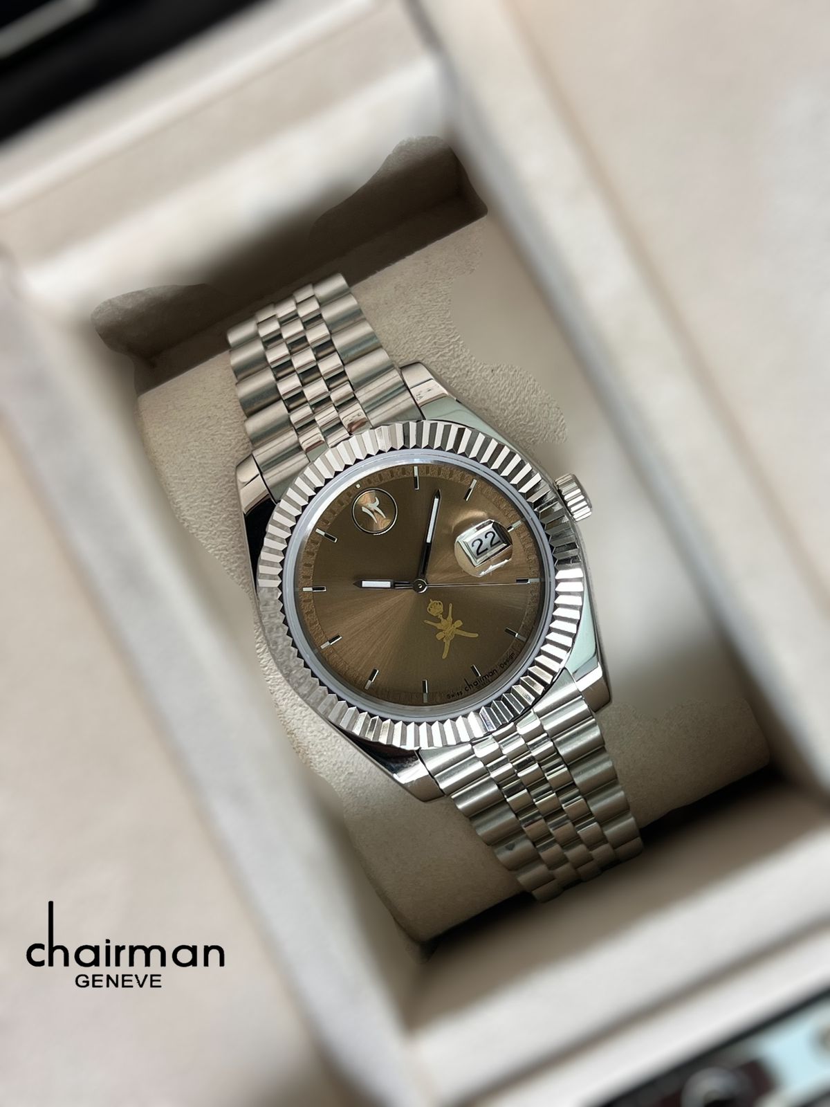 OMAN Emblem Chairman Geneve Arabic English Dated Brown Dial Silver Chain Gents Watch