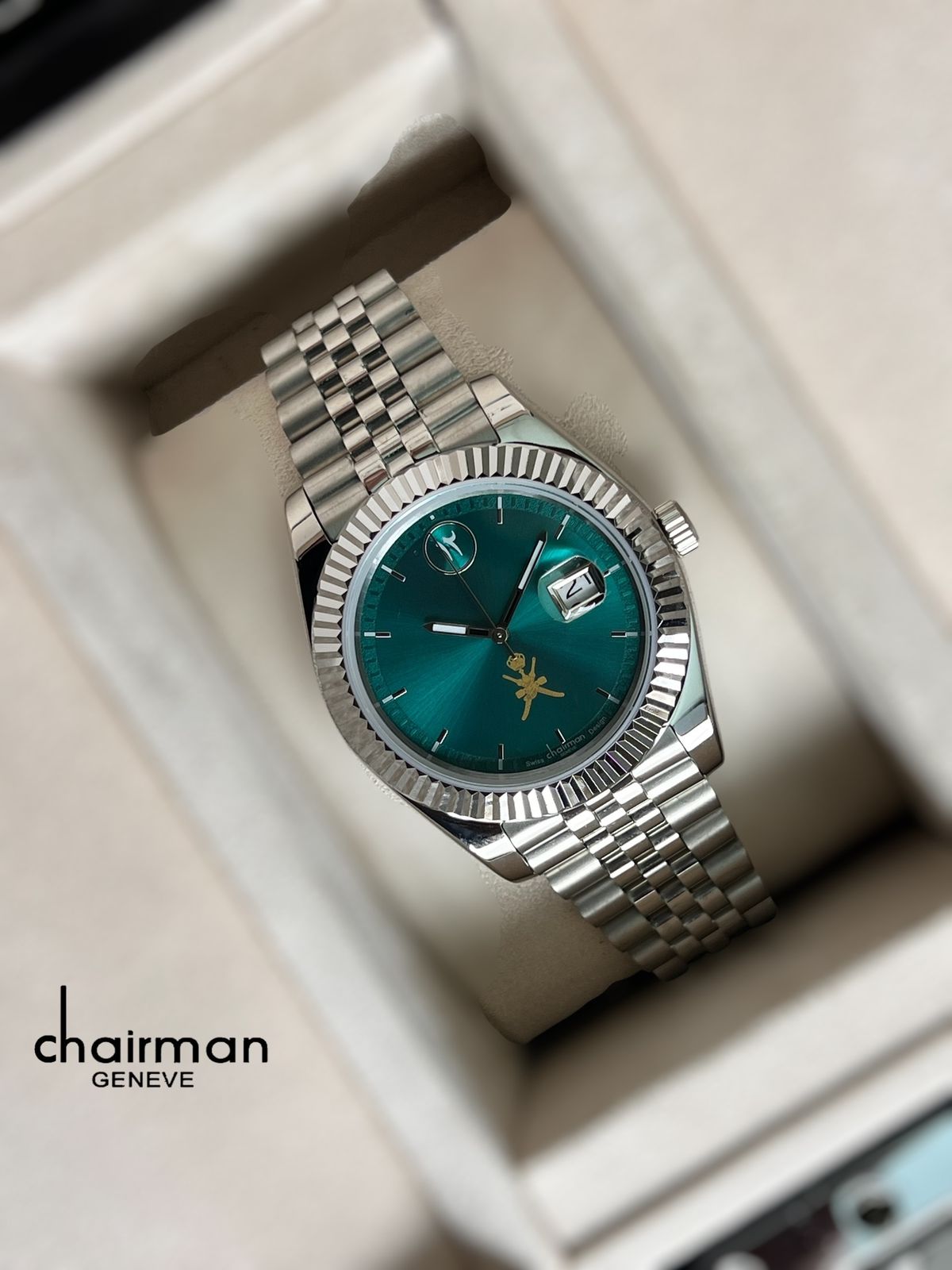 OMAN Emblem Chairman Geneve Arabic English Dated Green Dial Silver Chain Gents Watch
