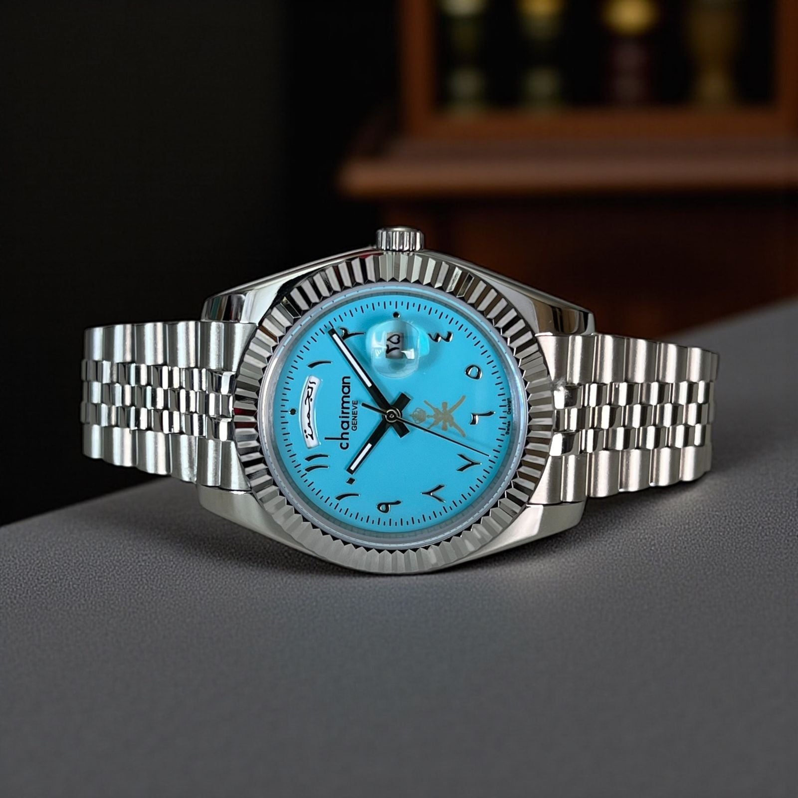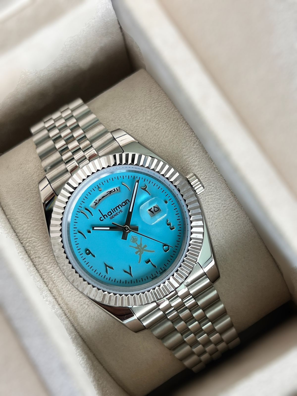 Oman Emblem Chairman Geneve Day And Dated Baby Blue Silver Chain Gents Watch