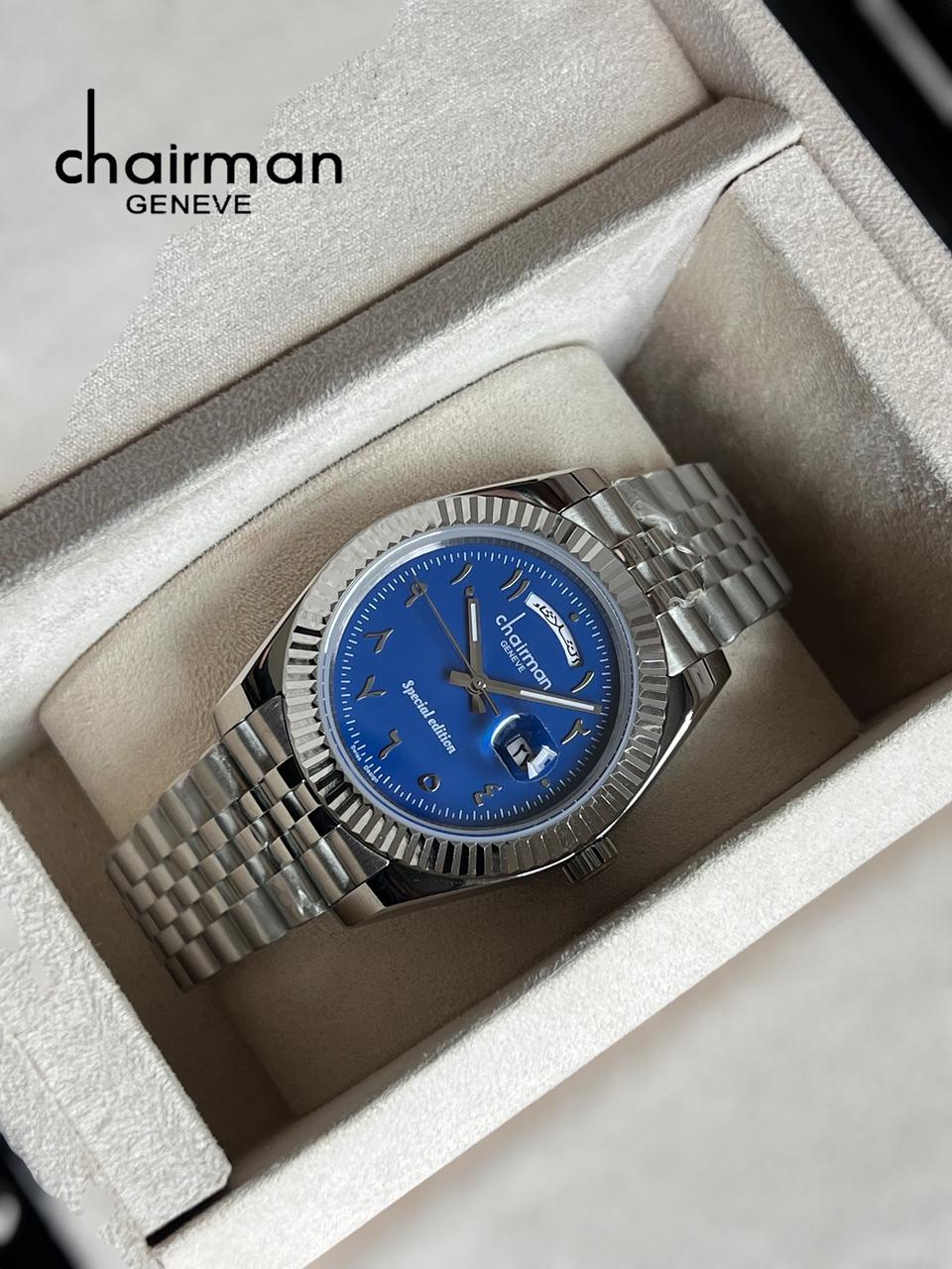 Special Edition Chairman Geneve Arabic Day And Dated Blue Dial Silver Chain Gents Watch