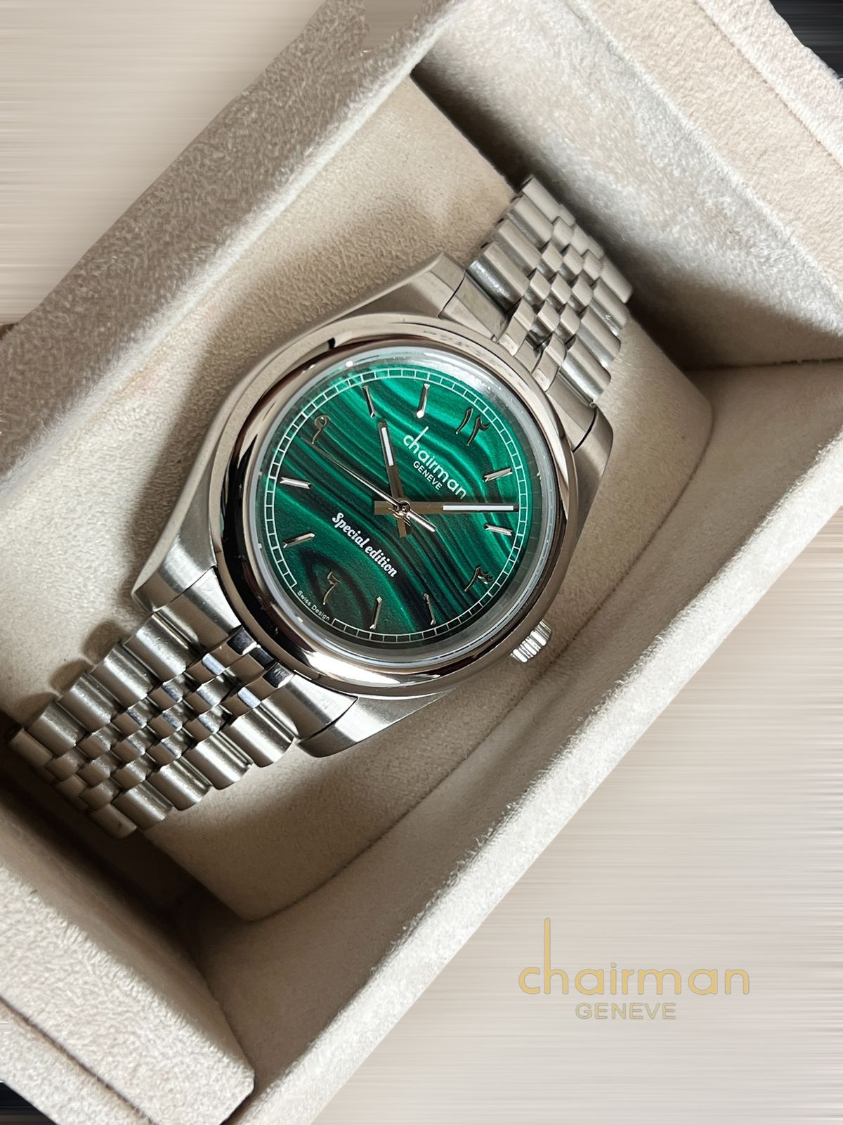 Introducing the exclusive Special Edition Chairman Geneve Arabic Green Dial Silver Chain Gents Watch. Featuring a sleek and sophisticated design, this timepiece is perfect for the modern gentleman. With its striking green dial and silver chain, it is sure to make a statement wherever you go. Elevate your style with this limited edition watch.
