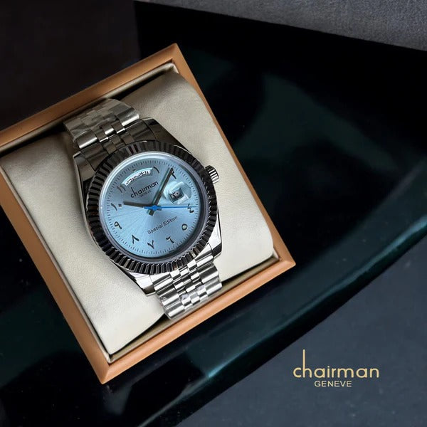 ساعة Chairman Geneve Day And Dated ذات الإصدار الخاص ذات المينا الأزرق السماوي وسلسلة فضية للرجال
