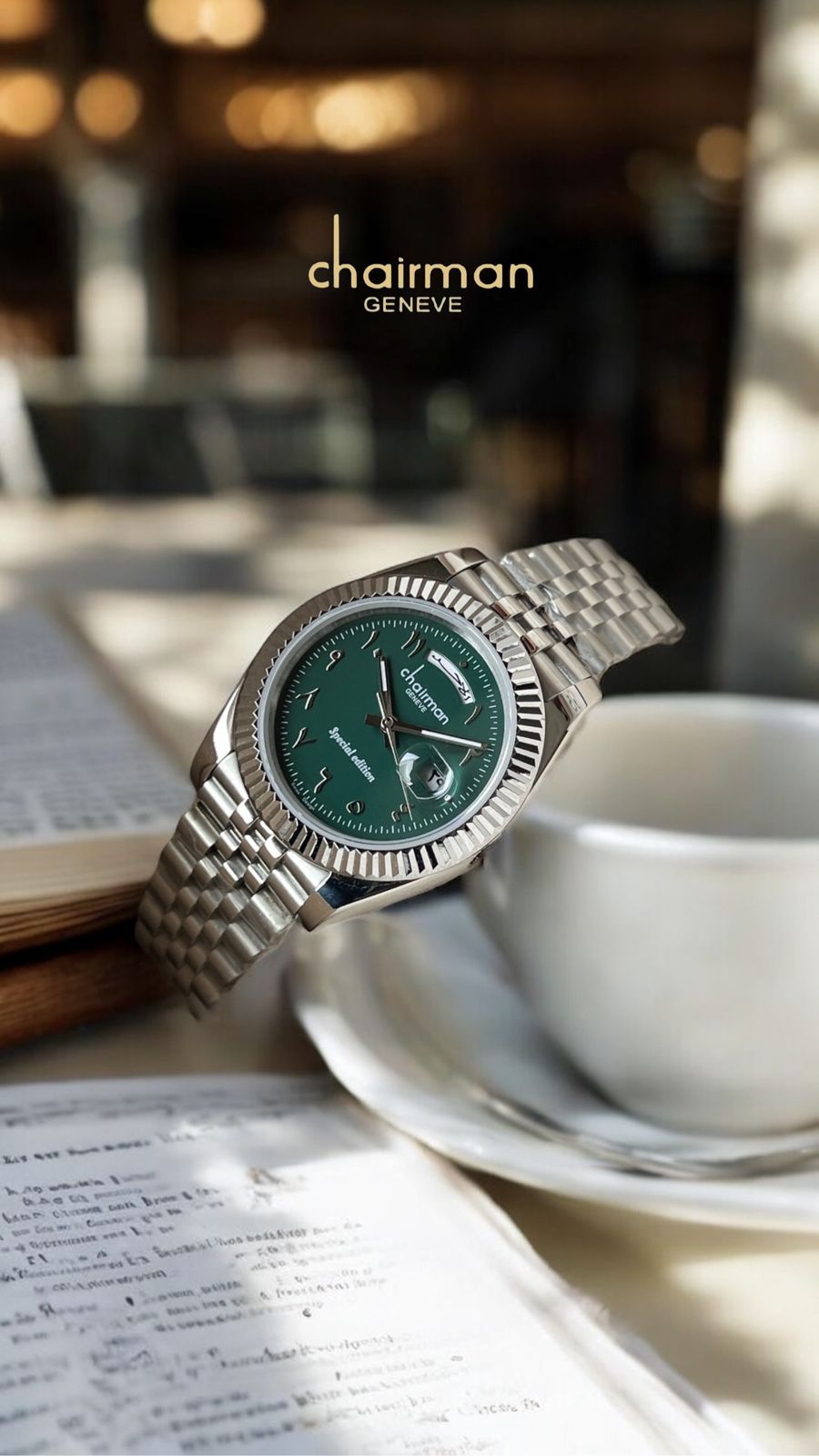 Discover timeless elegance with the Special Edition Chairman Geneve watch, featuring a striking green day and dated Arabic dial. Crafted for gentlemen, its silver chain adds a sophisticated touch to any outfit. This exclusive timepiece combines classic design with practical functionality, making it the perfect accessory for those who appreciate style and precision. Elevate your wristwear collection with this distinguished watch that stands out in every occasion.