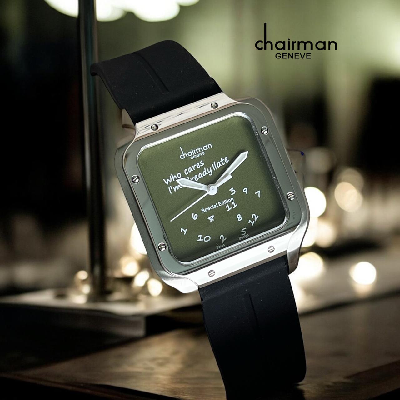 Experience timeless elegance with the Special Edition Chairman Geneve watch. Featuring a striking green dial paired with a sleek black strap, this gents' timepiece blends classic style with modern sophistication. Designed for those who appreciate refined details, it adds a bold touch to any outfit while ensuring reliable performance. Elevate your wristwear collection with this distinguished accessory that embodies both luxury and versatility.