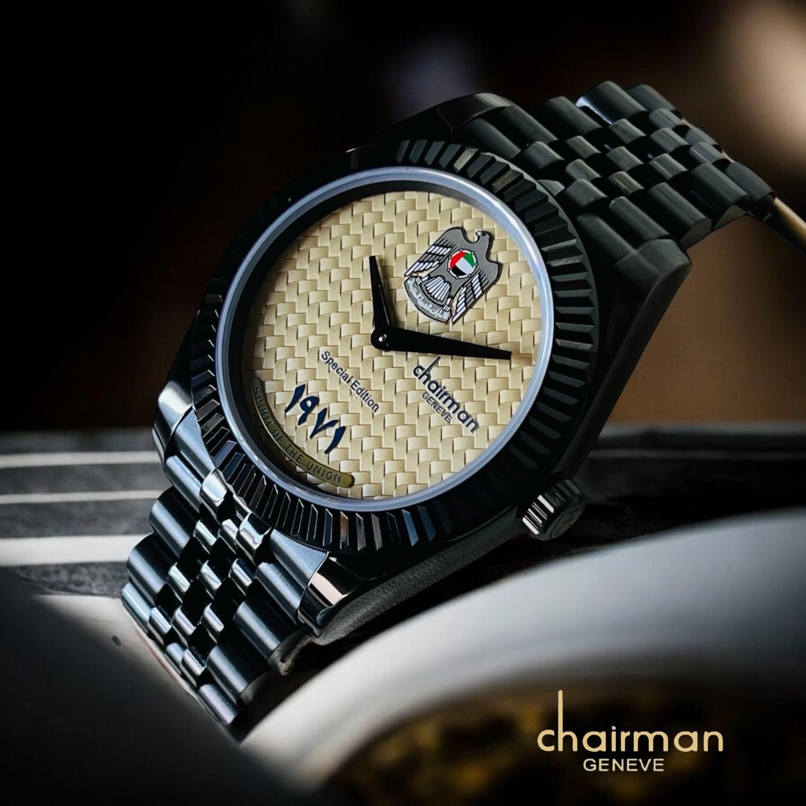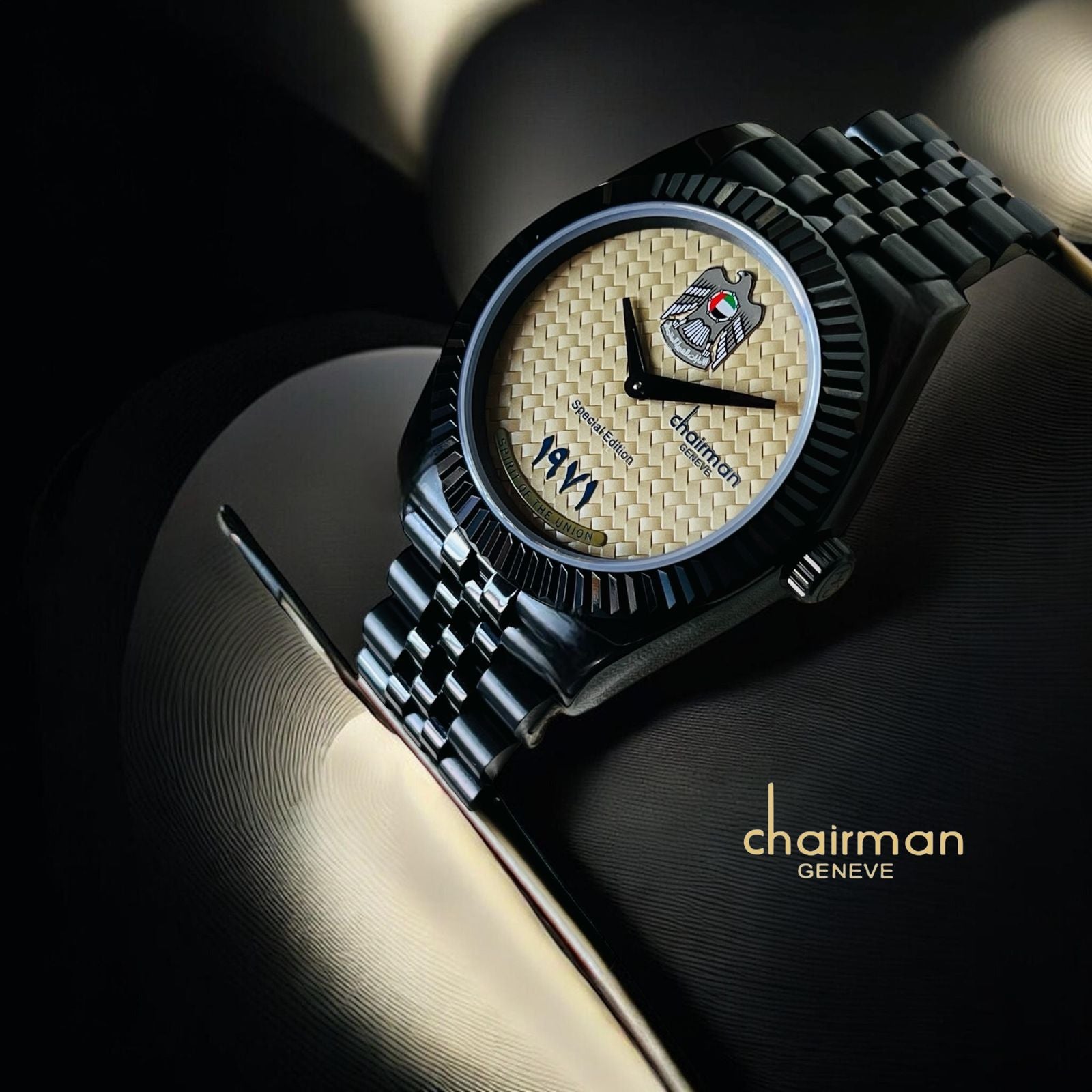 Elevate your wrist with this exclusive Special Edition Chairman Geneve timepiece, crafted to celebrate UAE heritage. Featuring a sophisticated beige dial paired with a striking black chain bracelet, this gents watch combines timeless elegance with patriotic pride. The UAE emblem adds a distinctive touch, making it a statement piece for collectors and watch enthusiasts. Perfect for formal occasions or everyday sophistication, this limited-edition watch delivers precision engineering wrapped in refined style. Own a piece of luxury that honors tradition while making a bold impression.