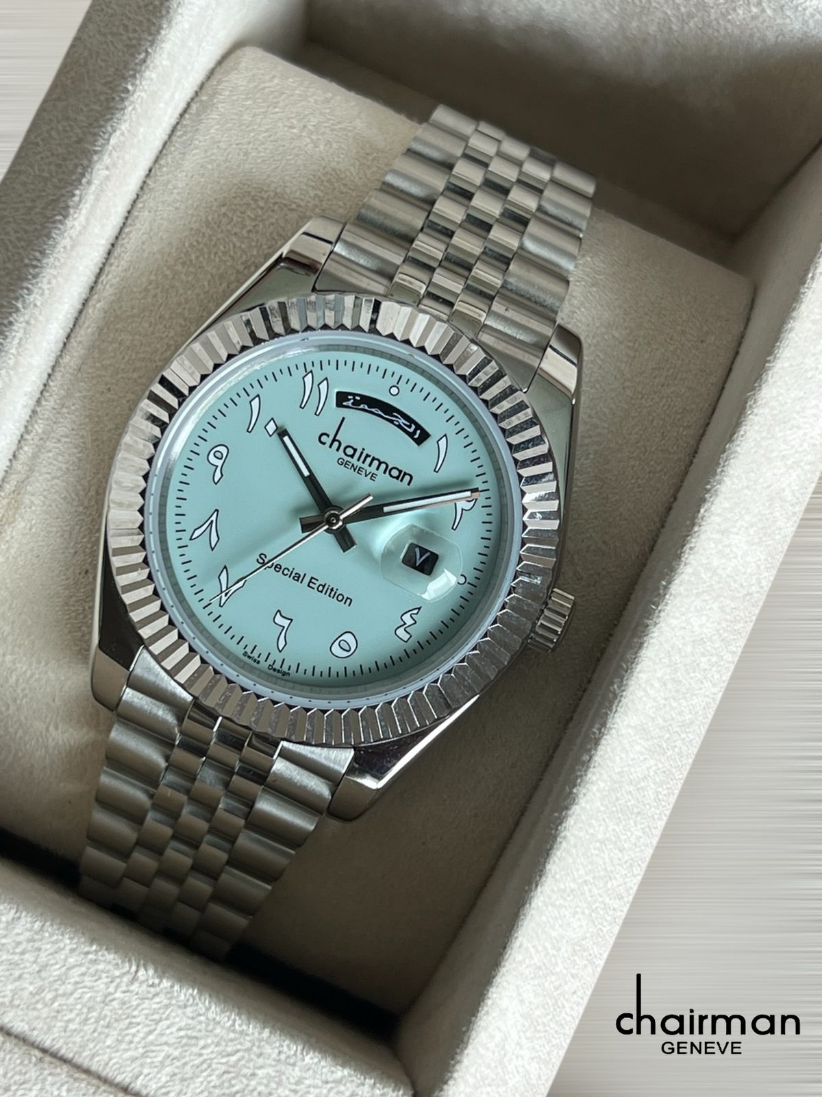 Introducing our elegant Special Edition Gents Watch in Sky Blue with a dated Arabic dial and a sleek silver chain. This timepiece is perfect for any occasion, adding a touch of style and sophistication to your wardrobe. Don't miss out on this limited edition accessory.