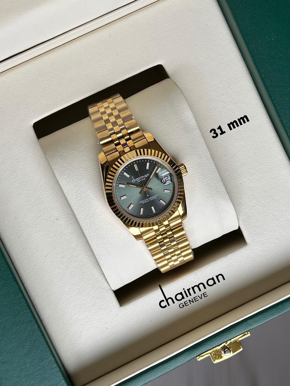 The Superlative Chronometer Chairman Geneve watch boasts a striking green dial with a convenient date display. The luxurious golden chain adds a touch of elegance to the ladies' timepiece. Expertly crafted for precision, this watch is the ultimate statement of style and sophistication.