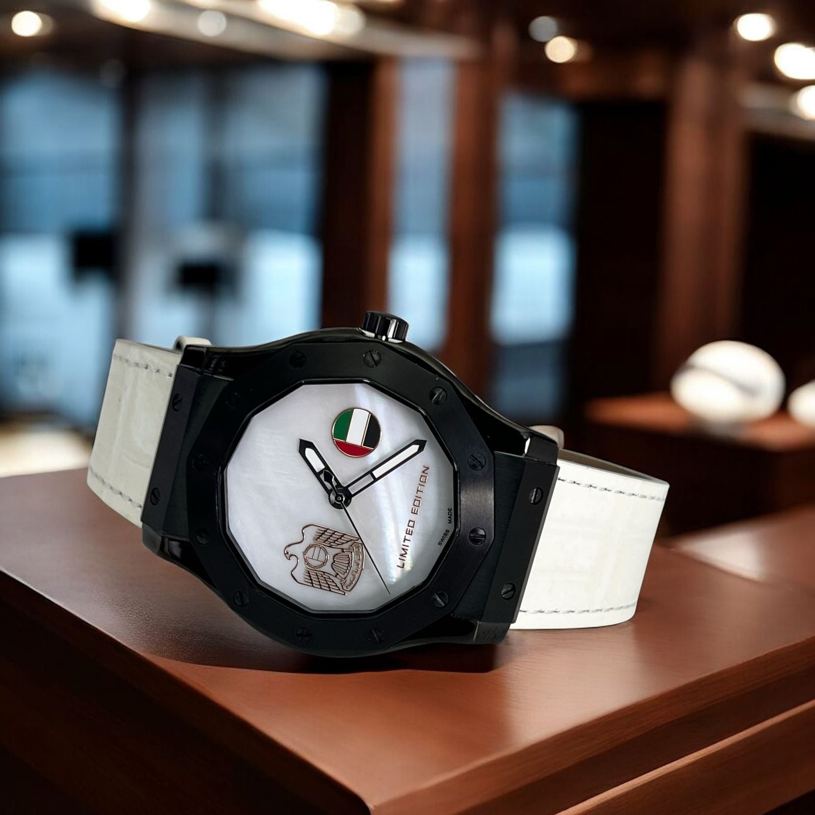Elevate your style with the Swiss Made Chairman Geneve Gents Watch, featuring a pristine white dial and a distinctive UAE emblem flag design. Paired with a soft creme strap, this timepiece blends classic elegance with national pride. Crafted for reliability and sophistication, it’s the perfect accessory for the modern gentleman seeking timeless quality and unique character.