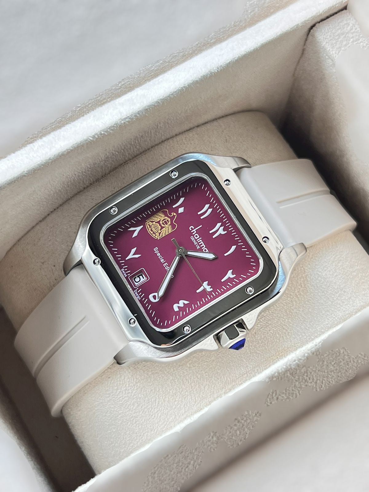 UAE Emblem Chairman Geneve Arabic Dated Maroon Dial Beige Strap Gents Watch