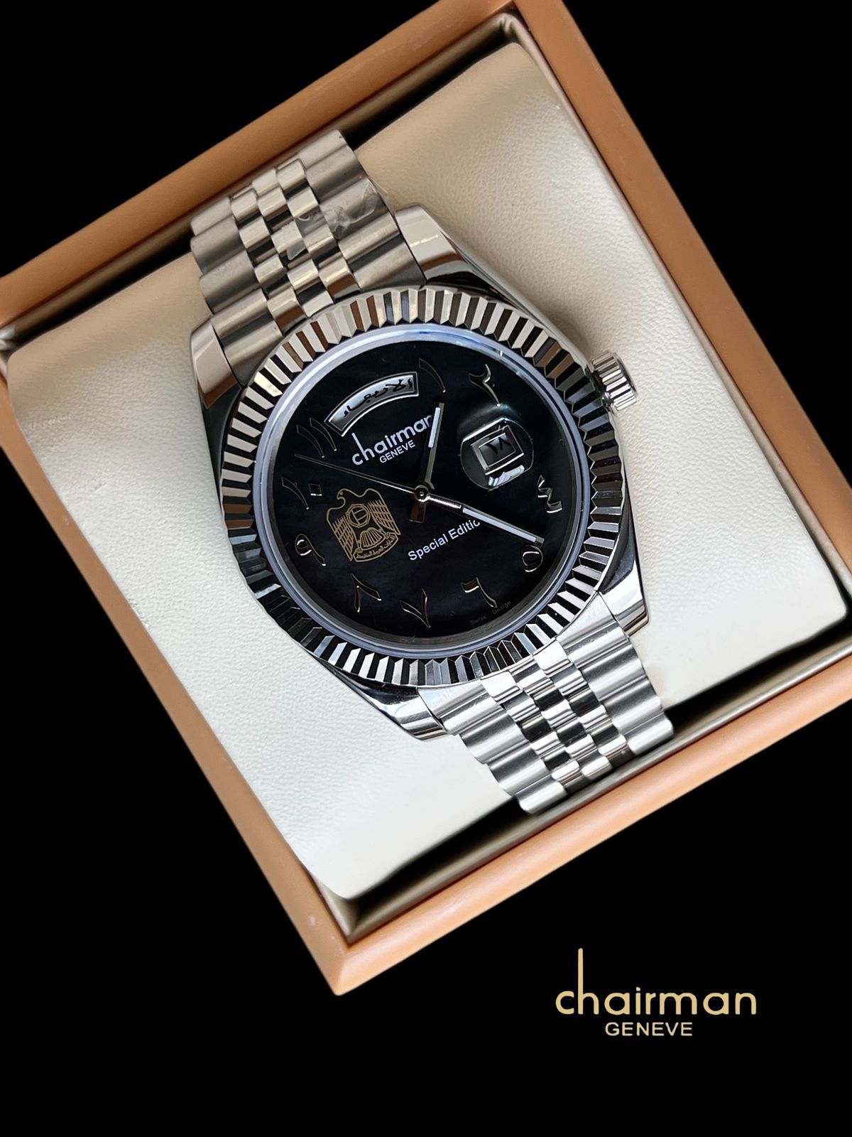 UAE Emblem Chairman Geneve Dated Arabic Black Dial Silver Chain Gents Watch