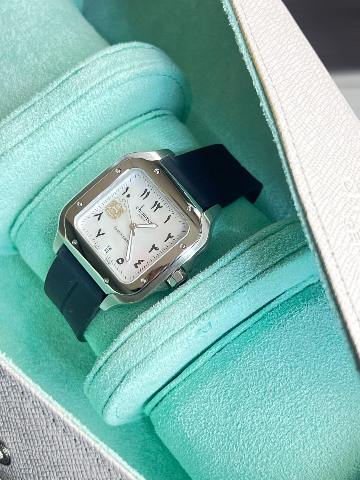 Elevate your wrist with the UAE Emblem Chairman Geneve, a distinguished timepiece that blends heritage with sophistication. Featuring an elegant white dial adorned with Arabic numerals and the prestigious UAE emblem, this gents watch makes a powerful statement of pride and style. The reliable date window keeps you organized throughout your day, while the sleek black strap ensures versatility for both formal occasions and everyday wear. Crafted with precision and designed for the discerning gentleman, this watch is more than an accessory—it's a symbol of excellence and cultural appreciation.