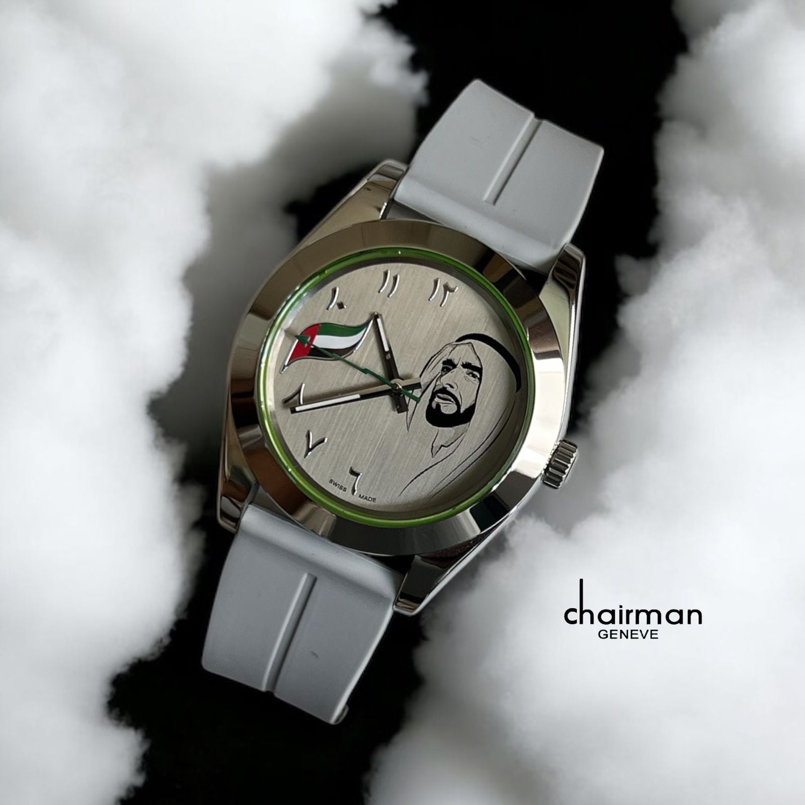 Celebrate heritage and style with the UAE Flag Sheikh Arabic Grey Dial Grey Strap Chairman Geneve Gents Watch. Featuring a sophisticated grey dial and matching strap, this timepiece combines elegance with cultural pride. Its distinctive Arabic numerals and subtle UAE flag detail make it a perfect accessory for the modern gentleman who values tradition and refinement. Durable and stylish, this watch complements any outfit while honoring a rich legacy.