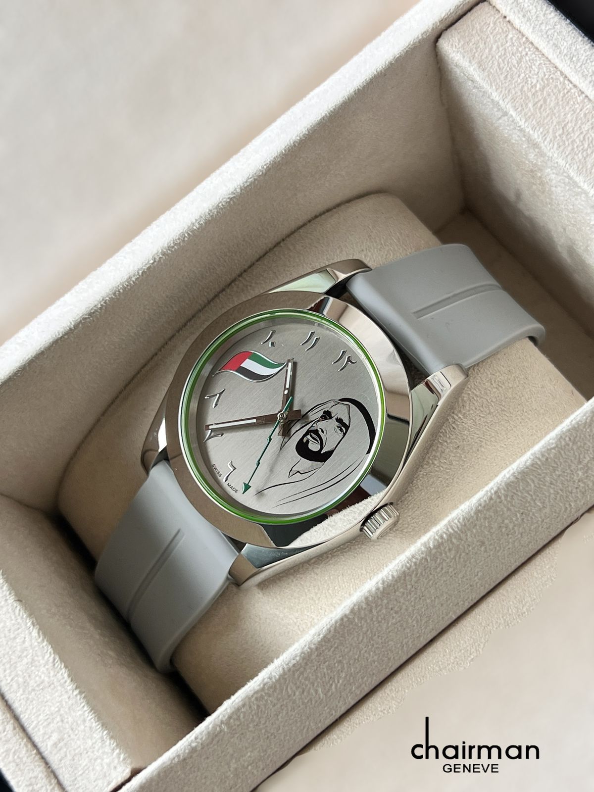 UAE Flag Sheik Arabic Grey Dial Grey Strap Chairman Geneve Gents Watch