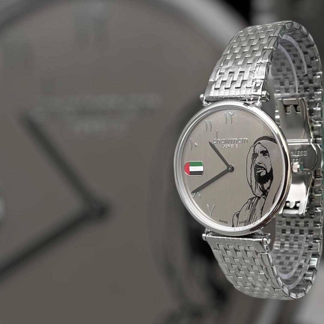 Celebrate heritage and style with the UAE Flag Sheik Photo Arabic Grey Dial Silver Chain Chairman Geneve Gents Watch. Featuring a distinctive grey dial adorned with Arabic numerals and a striking Sheik photo alongside the UAE flag, this timepiece blends cultural pride with elegant design. The silver chain adds a refined touch, making it perfect for formal occasions or daily wear. Crafted for gentlemen who appreciate tradition and sophistication, this watch is a unique accessory that honors legacy while keeping you punctual.