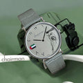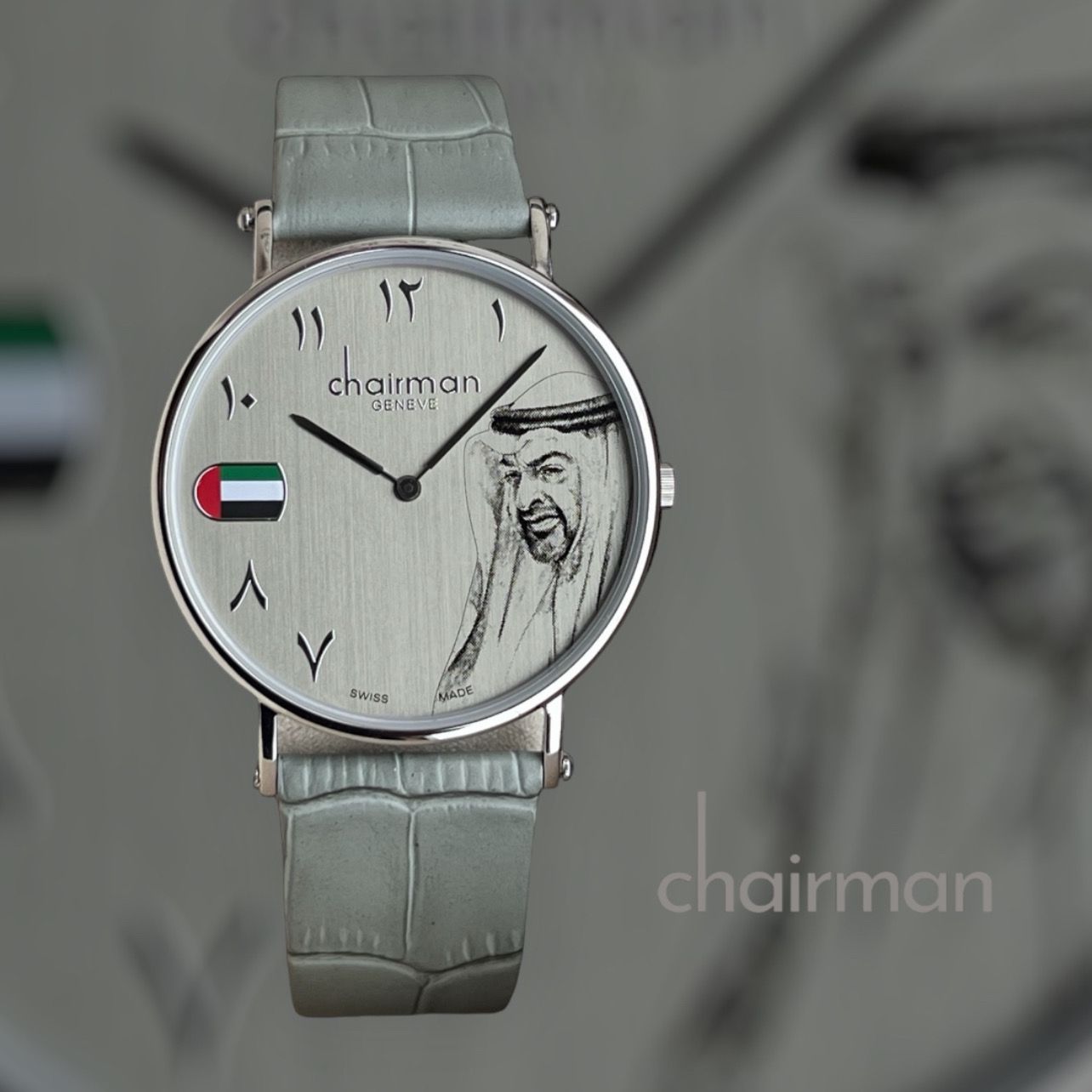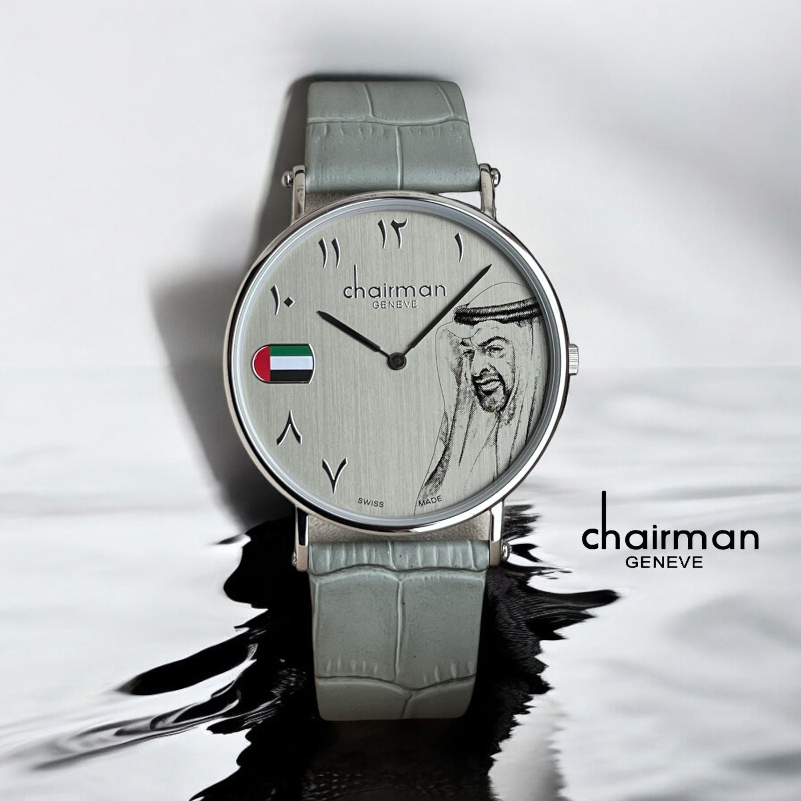أظهر وطنيتك مع ساعة علم الإمارات العربية المتحدة! الميناء العربي وحركة Chairman Geneve Swiss Made تجعلها ساعة فريدة من نوعها حقًا. الميناء الرمادي والحزام الجلدي يضفيان لمسة من الرقي. حافظ على الوقت بأناقة مع هذا الملحق الذي لا غنى عنه.