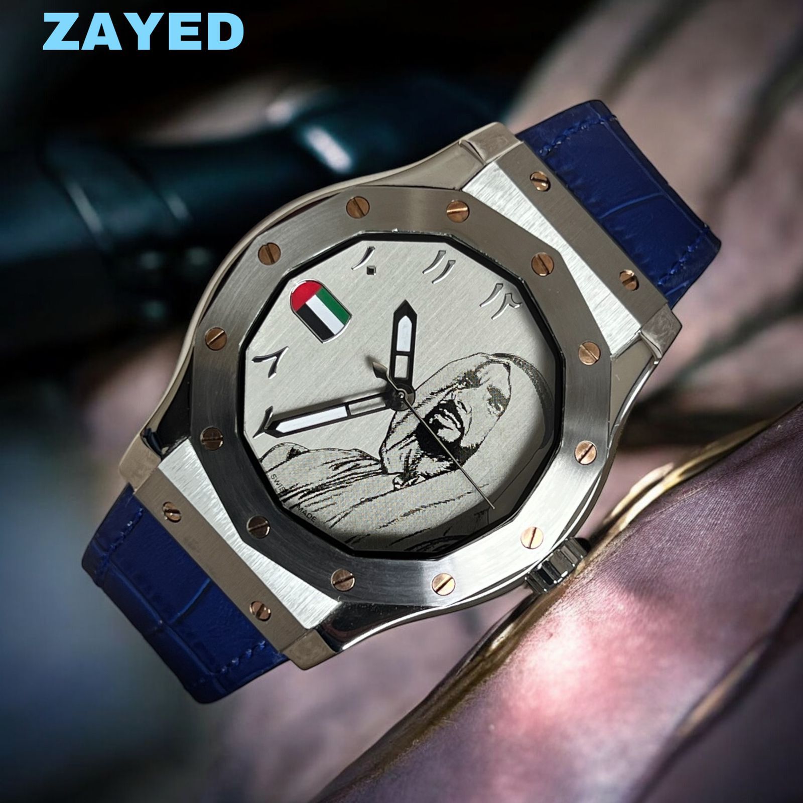 ساعة هدية علم الإمارات العربية المتحدة مع مينا عربية وسوار أزرق