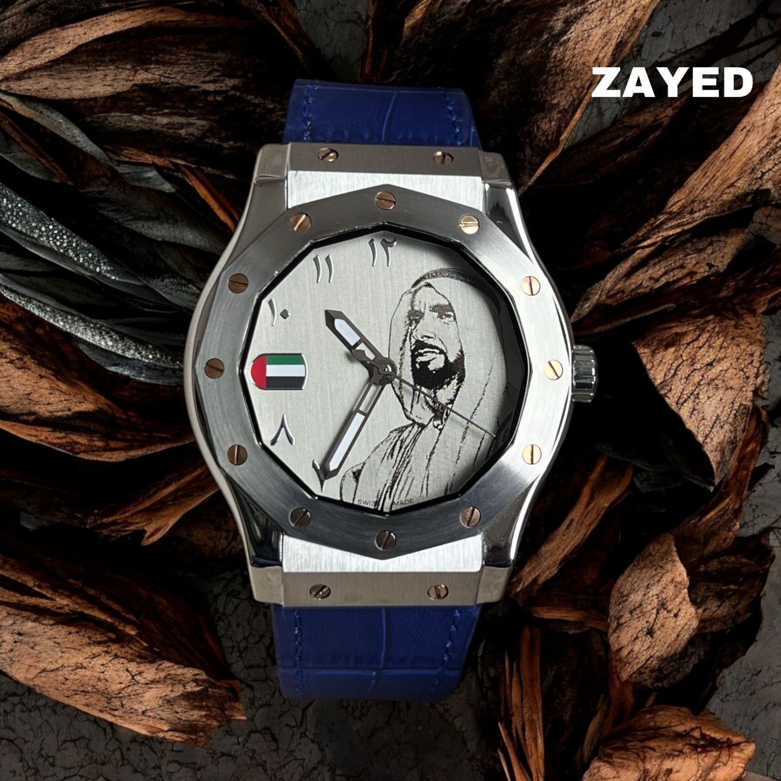 احتفل بفخرك بدولة الإمارات العربية المتحدة مع ساعة هدية علم الإمارات العربية المتحدة التي نقدمها لك. تتميز هذه الساعة بعلم الإمارات العربية المتحدة الشهير على الميناء، تكريمًا للأب المؤسس للبلاد، الشيخ زايد. يضفي الميناء العربي والحزام الأزرق لمسة من الثقافة والأناقة على هذه الساعة الفريدة. مثالية للإهداء أو الإضافة إلى مجموعتك الخاصة.