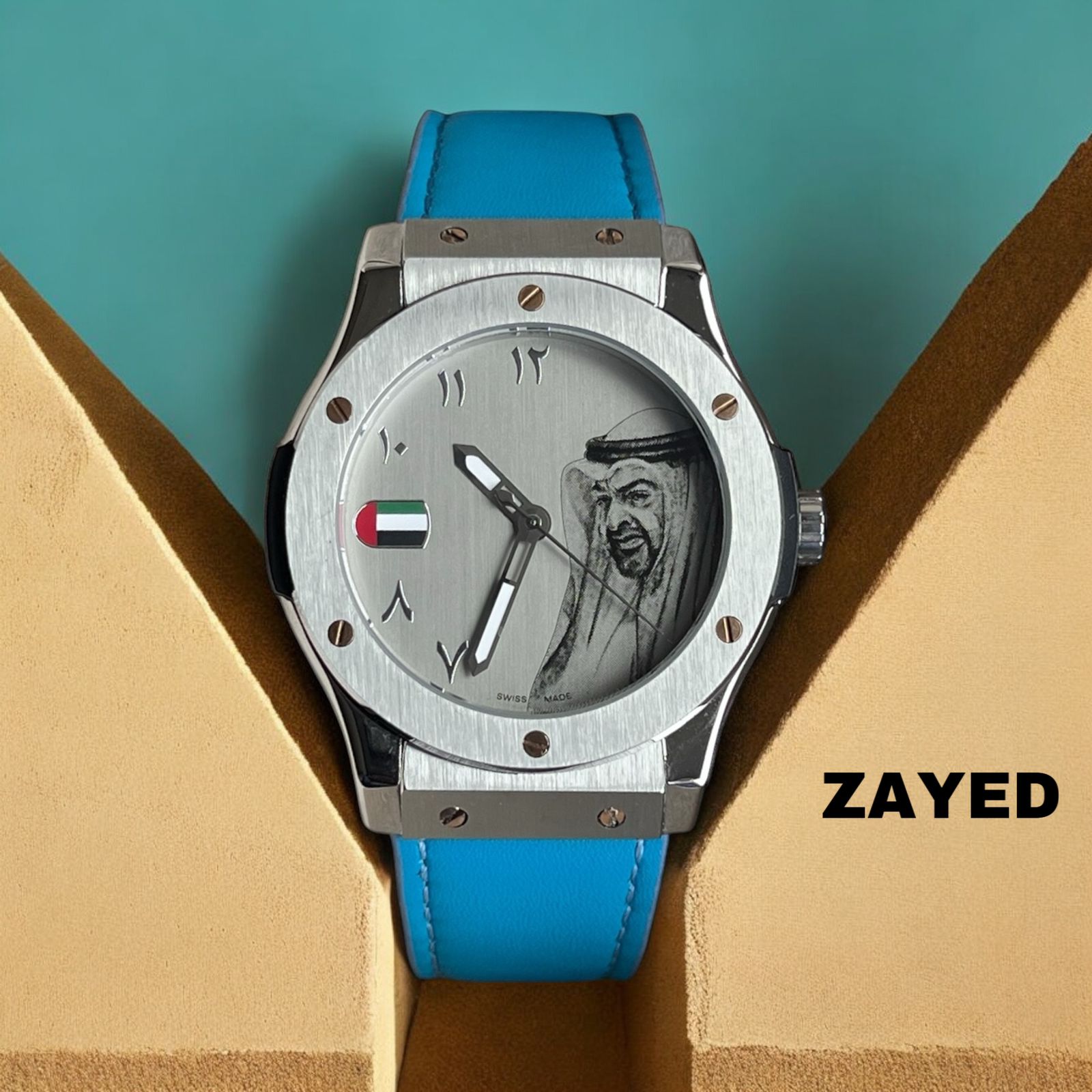 احتفل بحبك للإمارات العربية المتحدة بهذه الساعة التي تحمل شعار زايد. تتميز بمينا عربية جميلة وحزام أزرق سماوي مزين بعلم الإمارات العربية المتحدة. أظهر فخرك وأناقتك بهذه الساعة الفريدة. مثالية كهدية لنفسك أو لأحبائك.