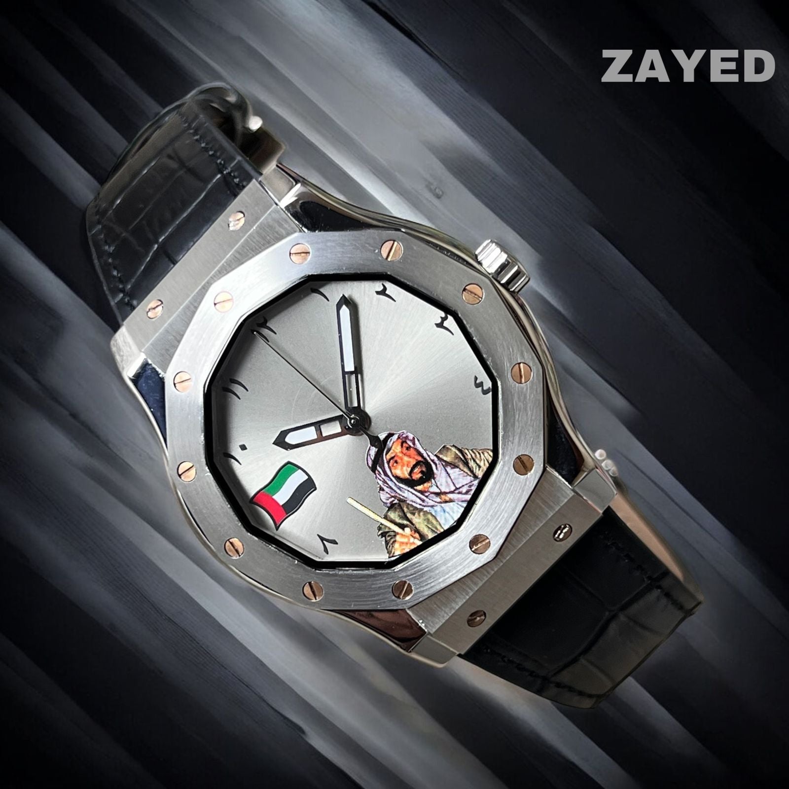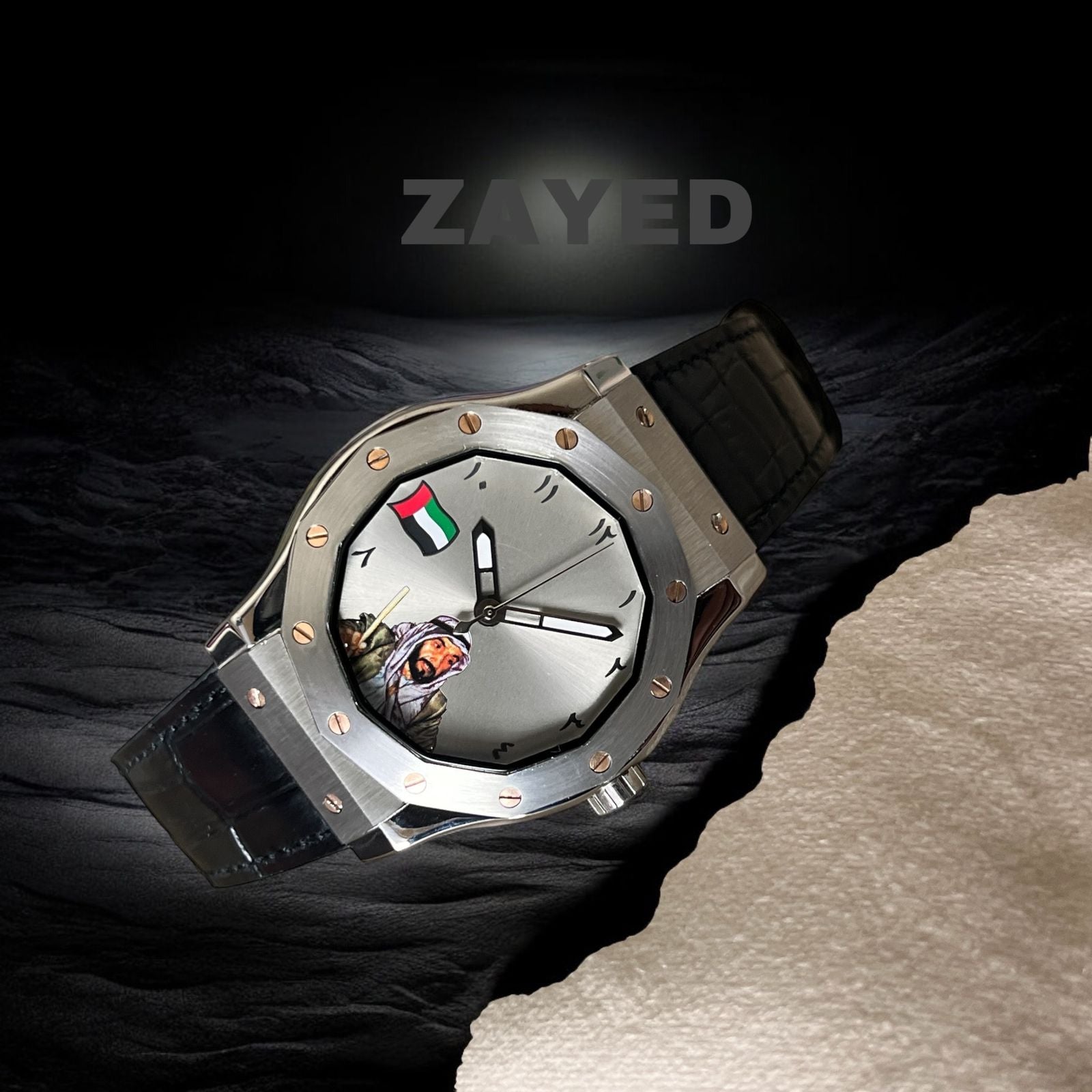 أظهر فخرك بدولة الإمارات العربية المتحدة بهذه الساعة الأنيقة التي تتميز بعلم الإمارات العربية المتحدة وتوقيع زايد. يضفي القرص العربي والحزام الجلدي الأسود لمسة من الرقي. ارتديها بفخر وجسد روح الوحدة والتقدم.