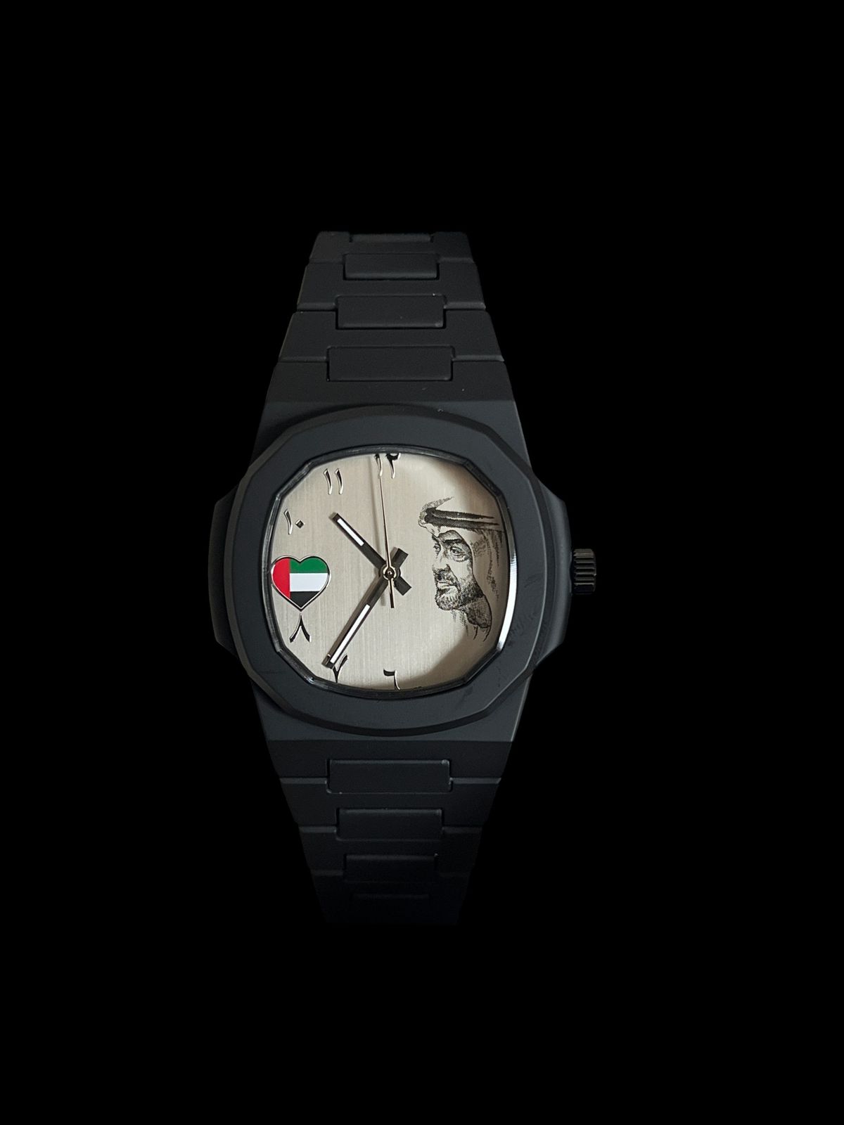Celebrate Emirati pride with this distinctive gents watch featuring a heart-shaped UAE flag design and revered Sheikh portrait. The elegant Arabic dial adds authentic cultural flair while the sophisticated timepiece delivers both patriotic style and practical functionality. Perfect for national celebrations or everyday wear to showcase your love for the Emirates.