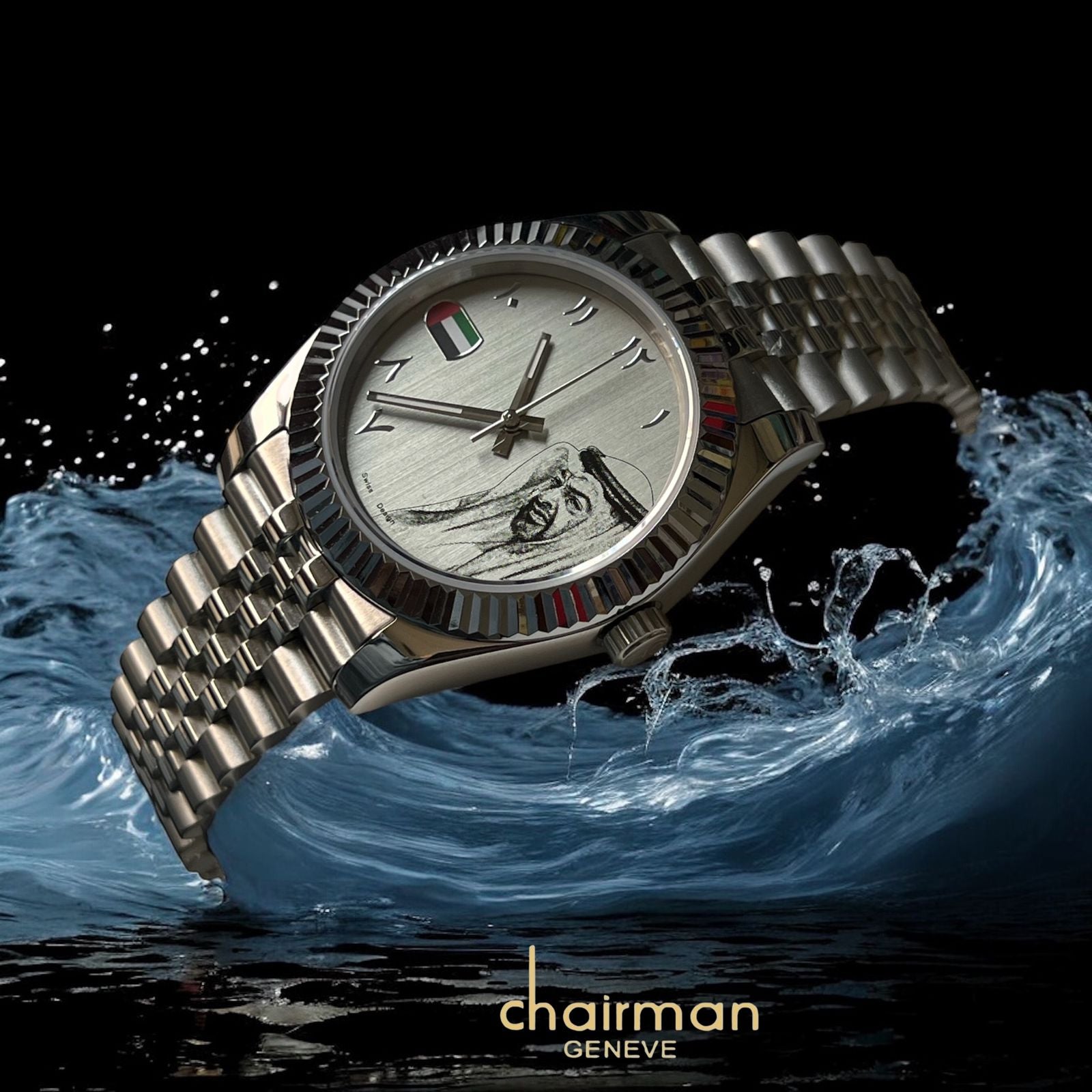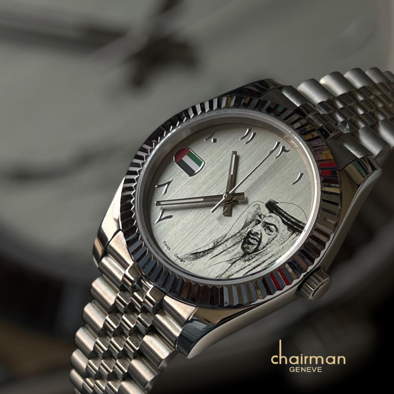 Elevate your wrist with this distinguished UAE Sheik Flag Photo Chairman Geneve timepiece, designed for the modern gentleman. Featuring an elegant grey dial with authentic Arabic numerals, this sophisticated watch combines cultural pride with timeless elegance. The gleaming silver chain bracelet adds a touch of luxury, while the precision movement ensures reliable timekeeping. Perfect for formal occasions or everyday wear, this gents watch makes a bold statement about heritage and style. Ideal for those who appreciate fine craftsmanship and meaningful design.