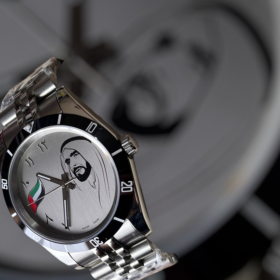 ساعة زايد سويسرية الصنع بمينا عربية وسوار فضي بعلم الإمارات العربية المتحدة
