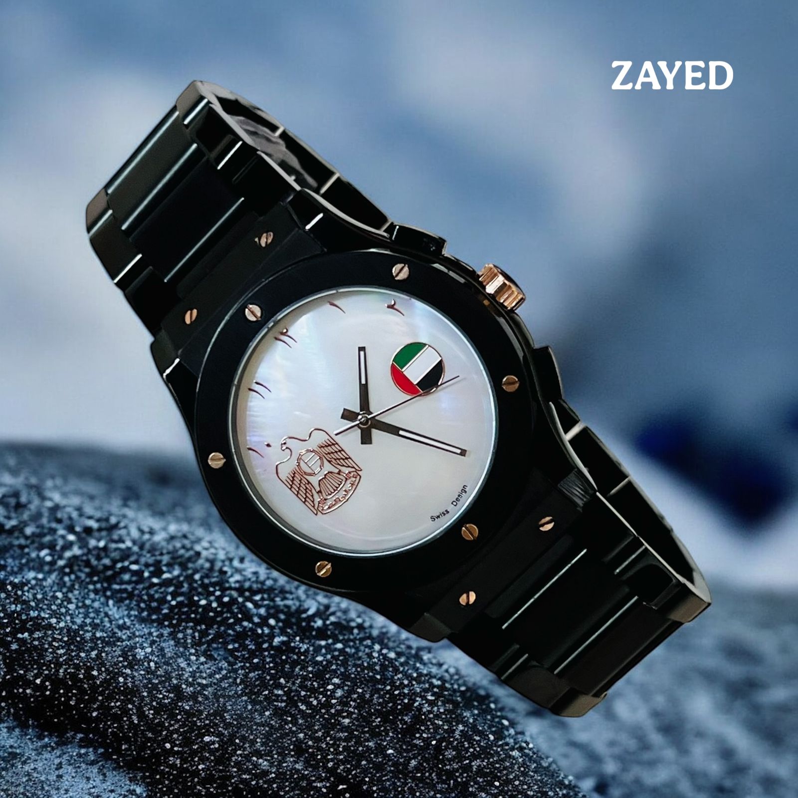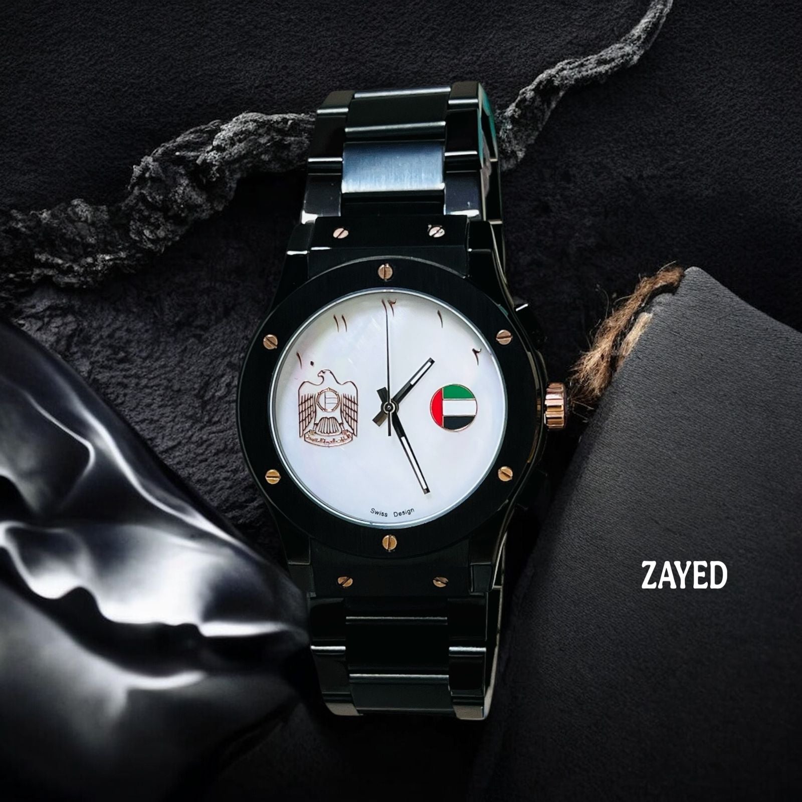 Celebrate Emirati pride with this distinguished timepiece featuring the iconic Zayed UAE flag emblem. The elegant white dial showcases Arabic numerals, blending traditional heritage with contemporary design. Crafted with a sleek black chain strap, this gents watch delivers both sophistication and patriotic flair. Perfect for those who value cultural significance and refined style, it makes an exceptional gift or personal statement piece. Ideal for everyday wear or special occasions, this watch honors the legacy of the UAE while keeping you punctually connected.