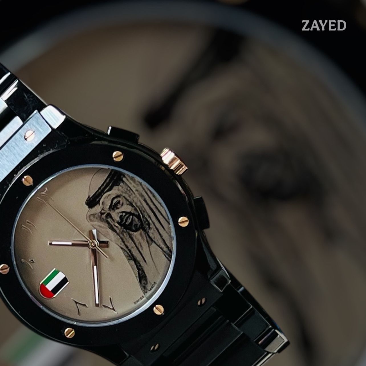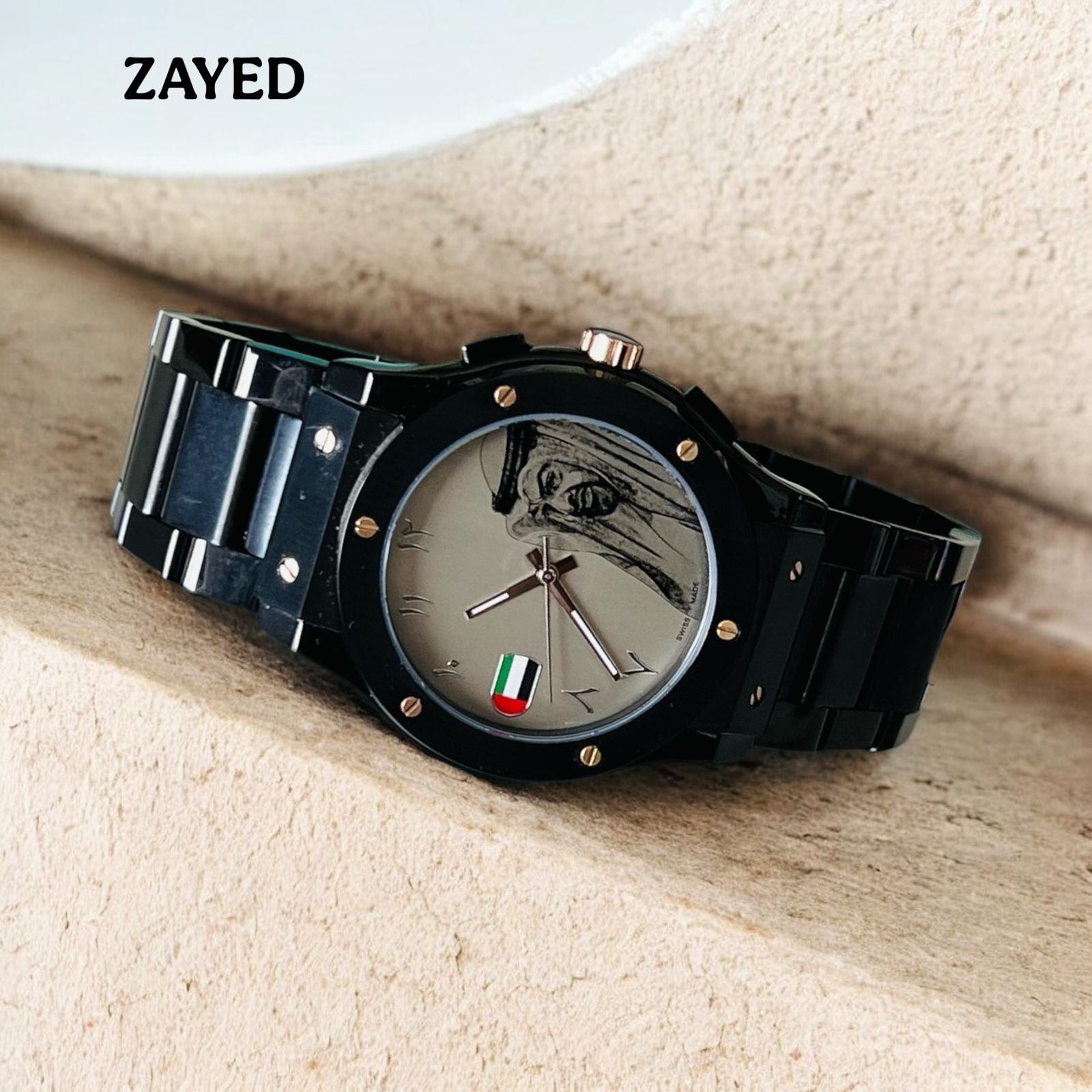 Celebrate Emirati pride with this distinguished timepiece featuring the iconic Zayed UAE Sheik flag design. The sophisticated grey dial pairs elegantly with a sleek black chain bracelet, creating a refined look suitable for any occasion. Arabic numerals add cultural authenticity while the precision movement ensures reliable timekeeping. Perfect for gentlemen who value heritage and style, this watch makes a bold statement about national pride and refined taste. An ideal gift or personal accessory that honors the legacy of the UAE.